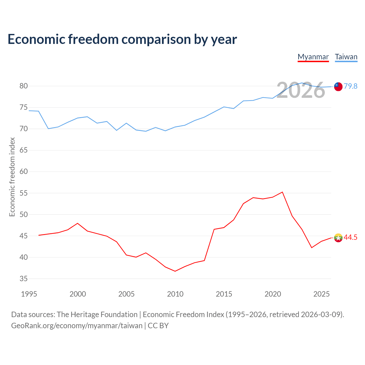 The Economic Freedom Index for Myanmar is 44.5, ranking 180/197, compared to 79.8 for Taiwan, ranking 6/197. The chart above displays a comparison of annual changes in economic freedom indexes.