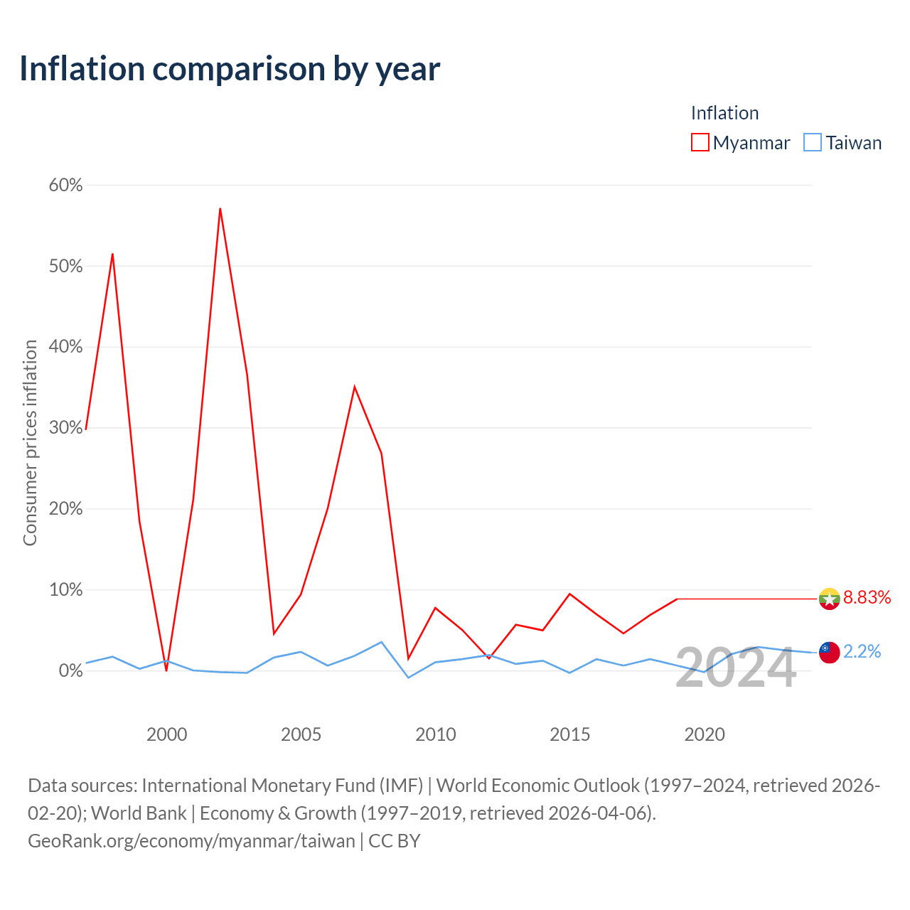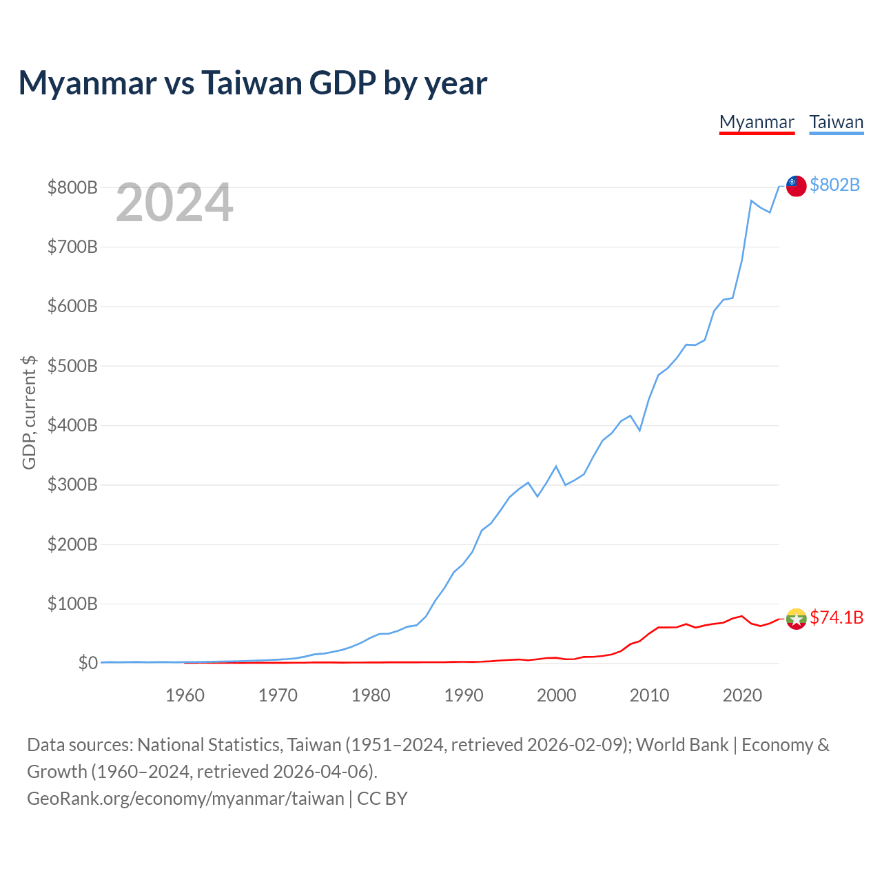 Myanmar has a GDP of $74.1B compared to $802B for Taiwan, ranking 85/197 and 22/197 by economy size, respectively.