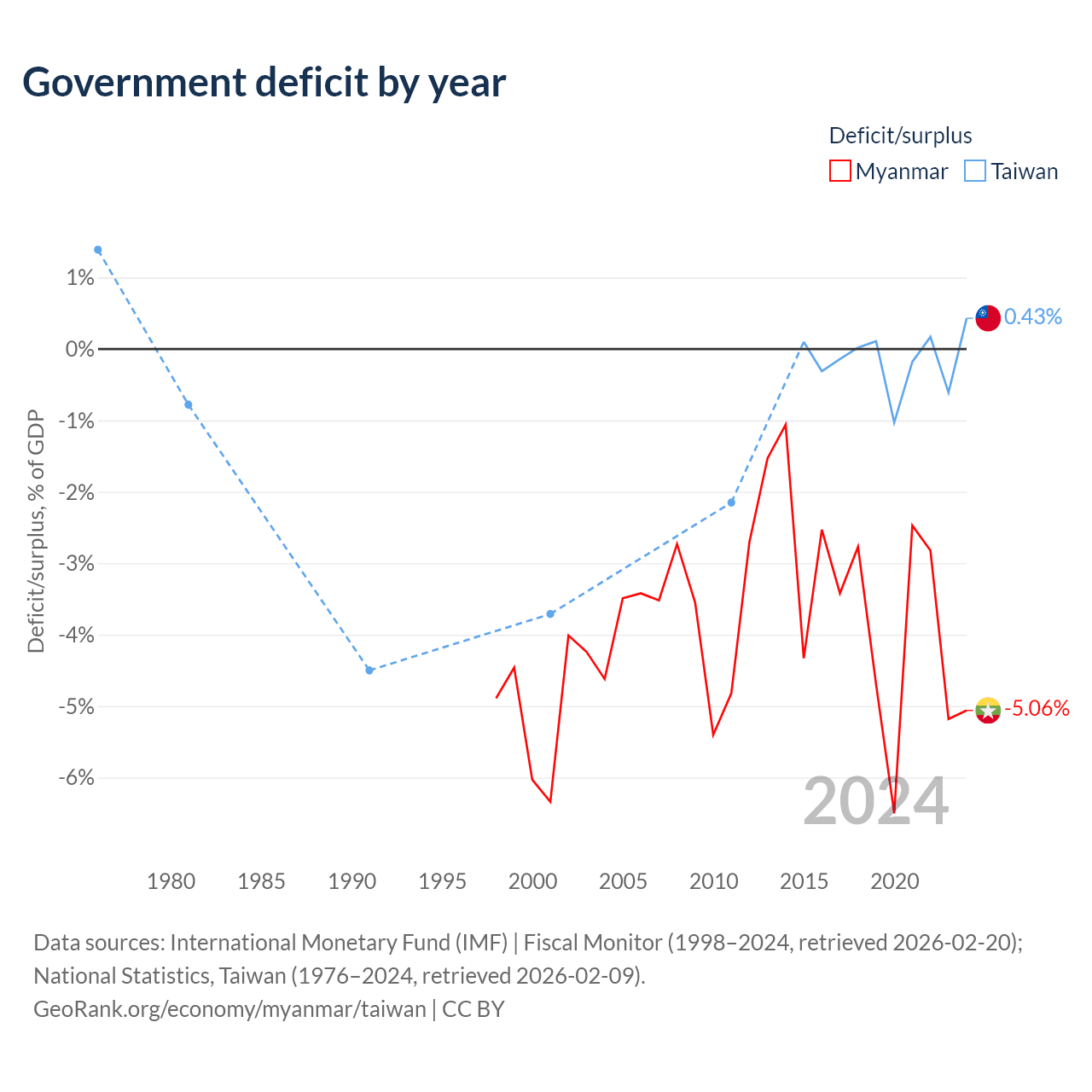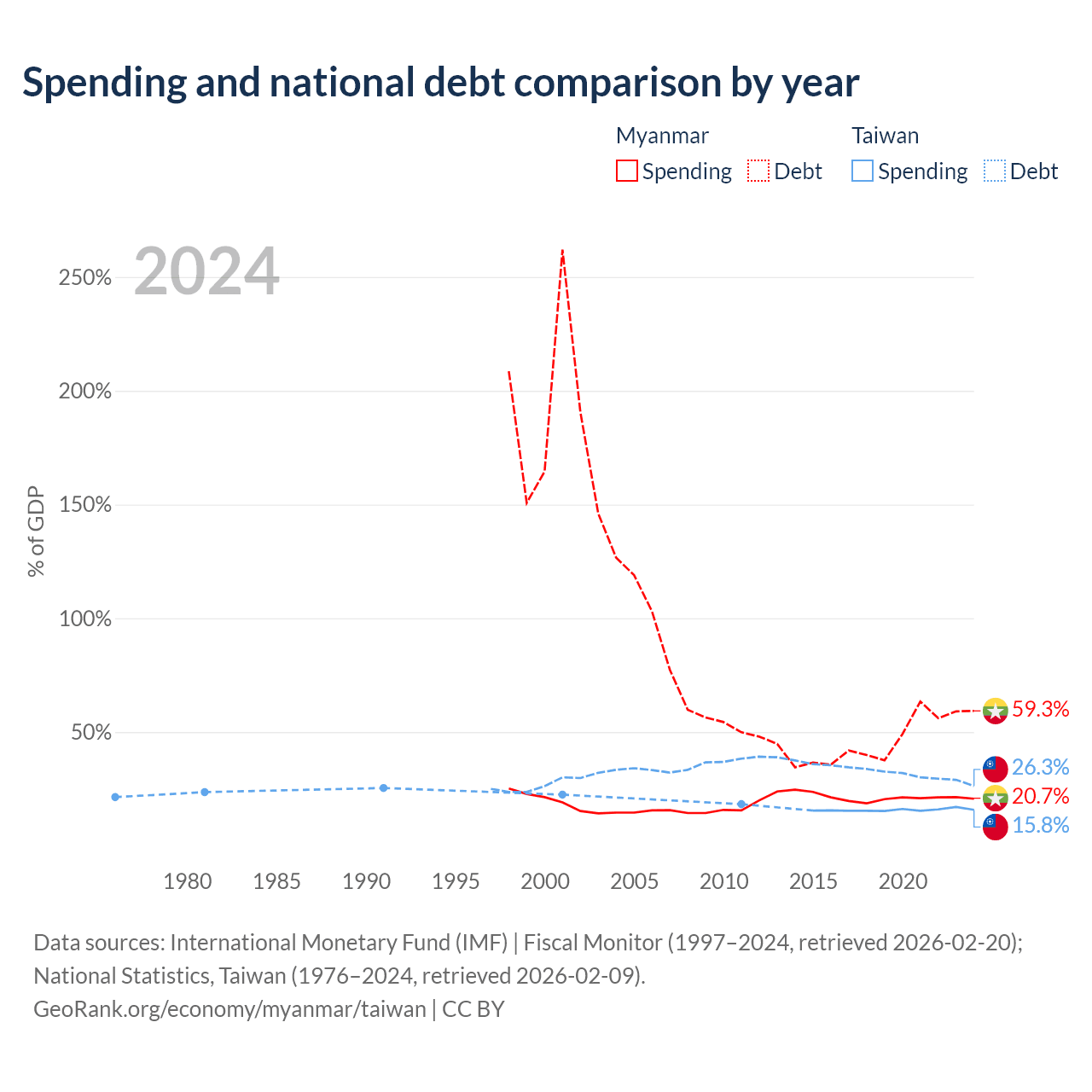 Myanmar has $44B in government debt (59.3% of GDP), compared to $211B (26.3% of GDP) in Taiwan.