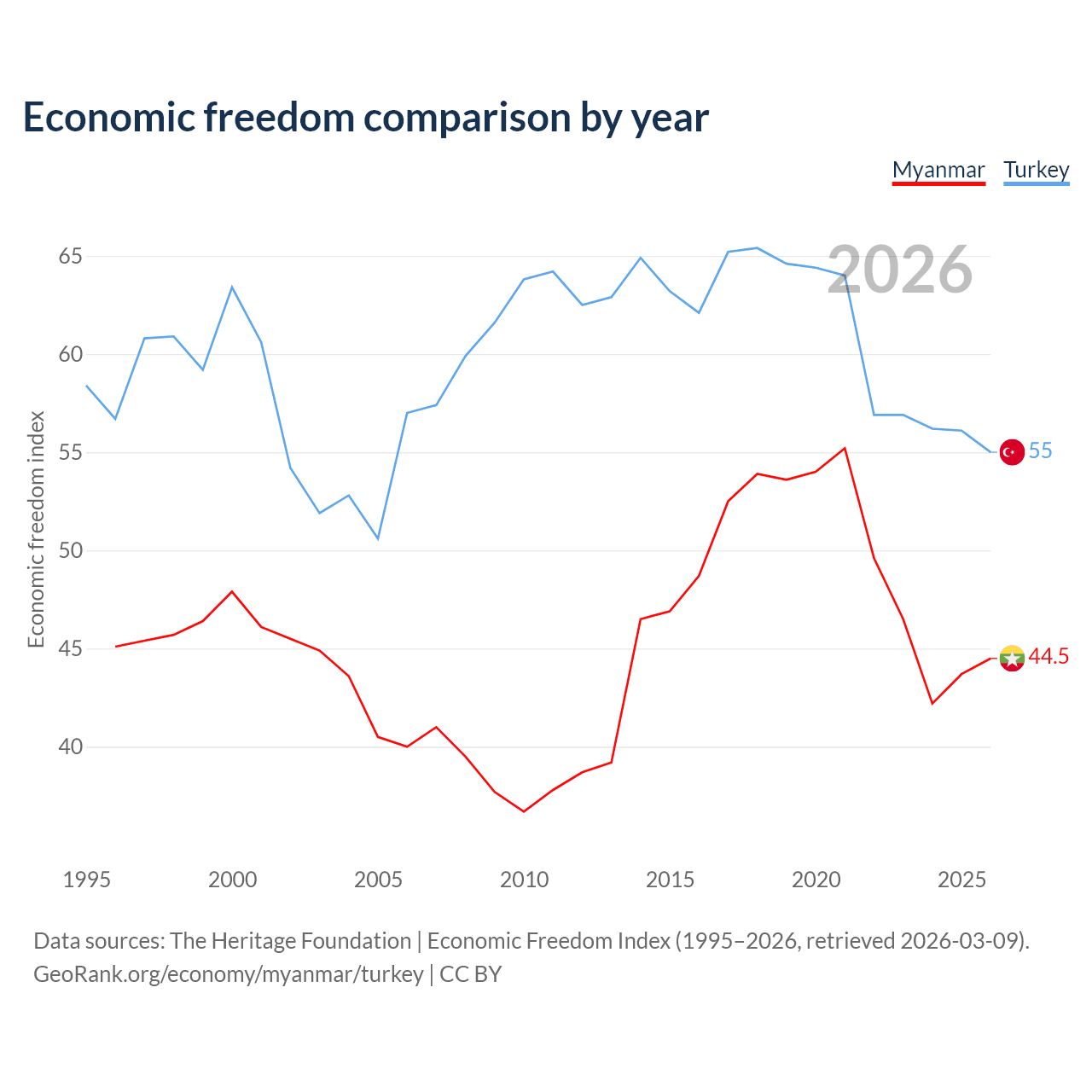 The Economic Freedom Index for Myanmar is 44.5, ranking 180/197, compared to 55 for Turkey, ranking 129/197. The chart above displays a comparison of annual changes in economic freedom indexes.