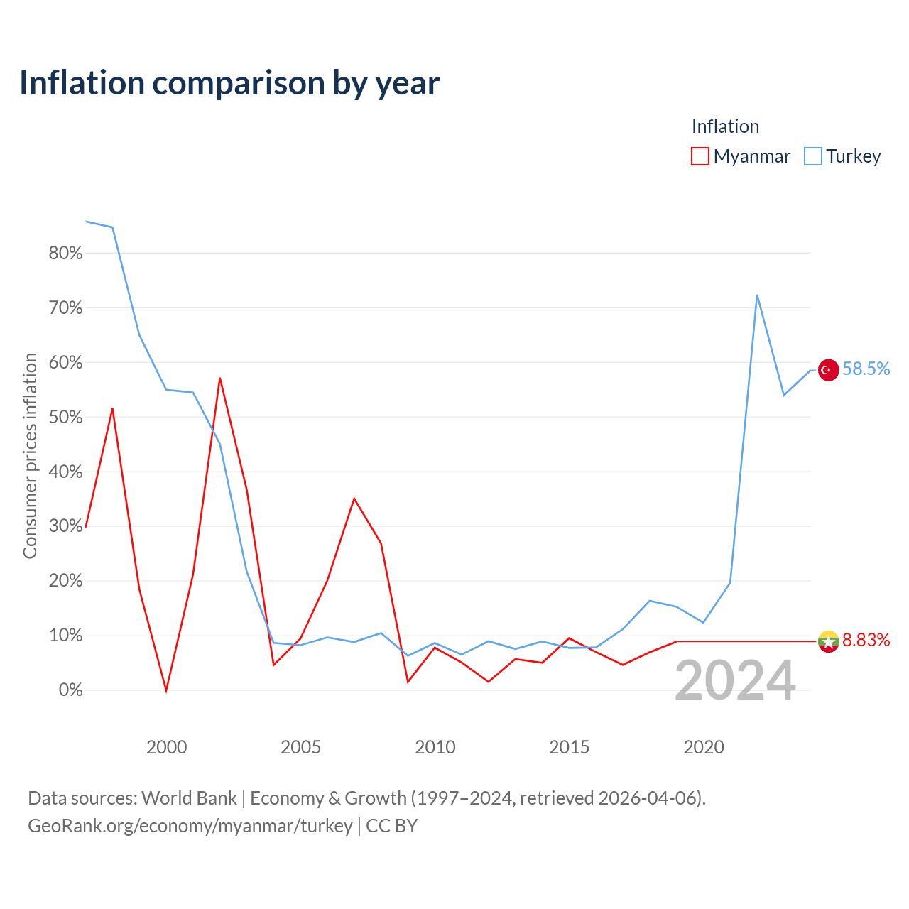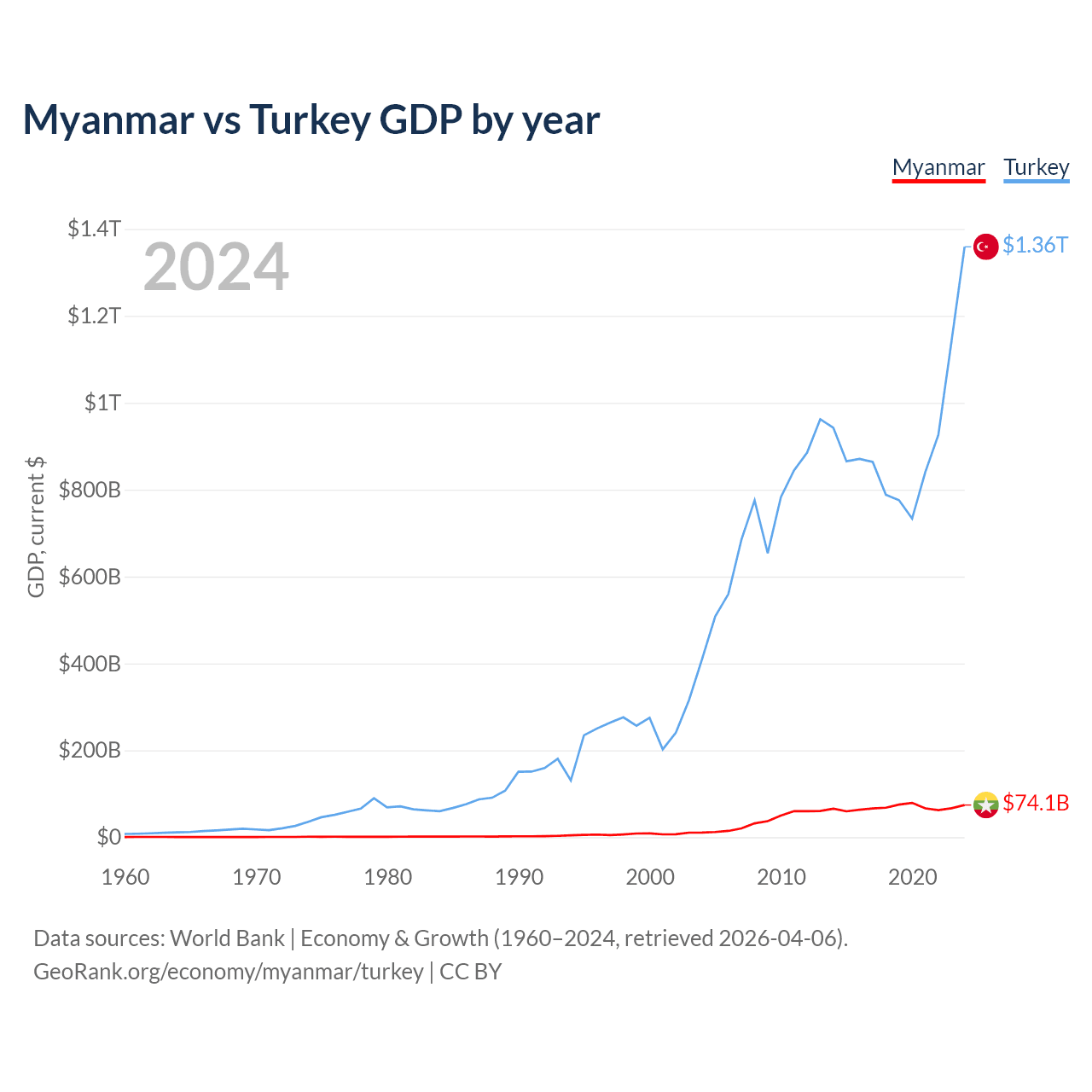 Myanmar has a GDP of $74.1B compared to $1.36T for Turkey, ranking 85/197 and 17/197 by economy size, respectively.