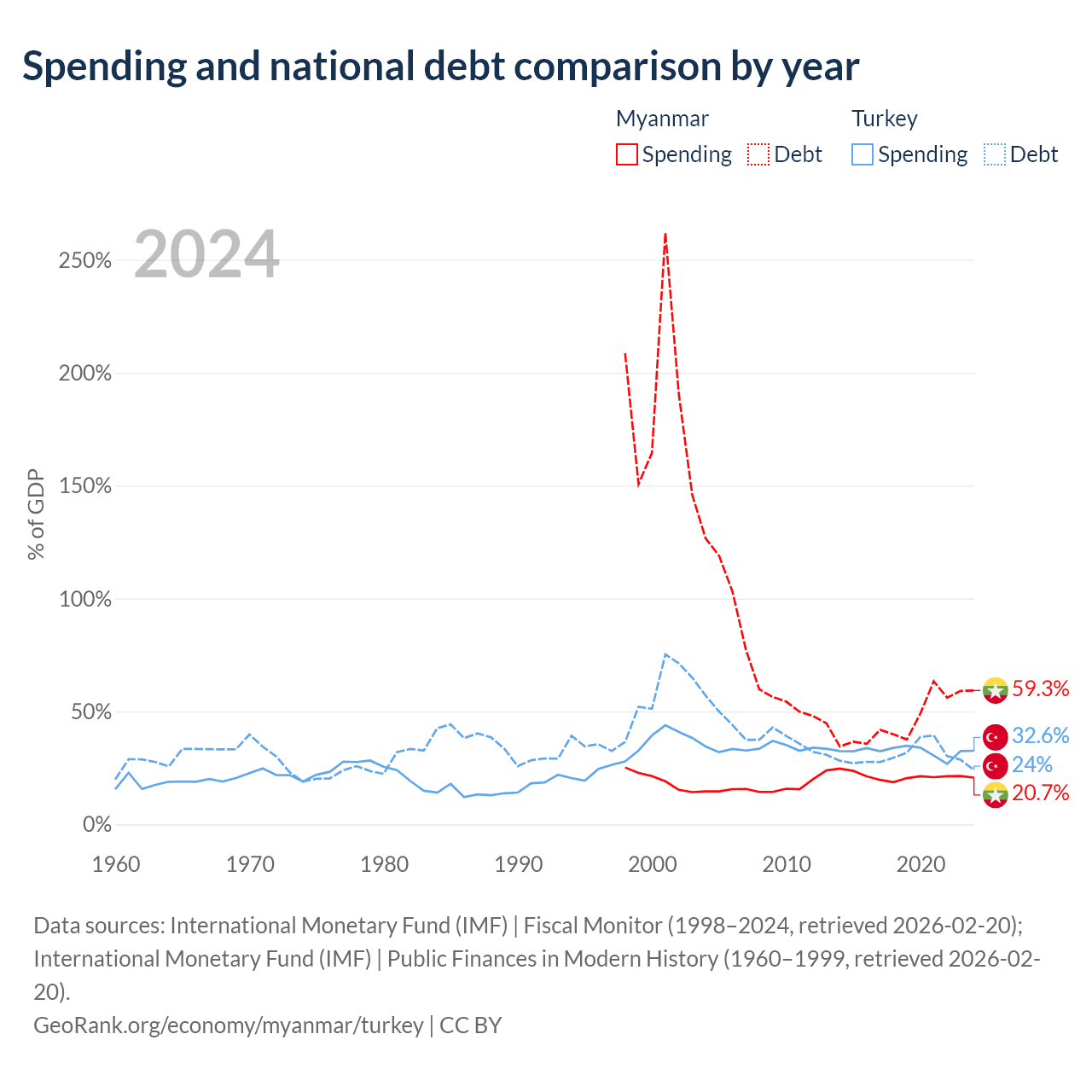 Myanmar has $44B in government debt (59.3% of GDP), compared to $327B (24% of GDP) in Turkey.