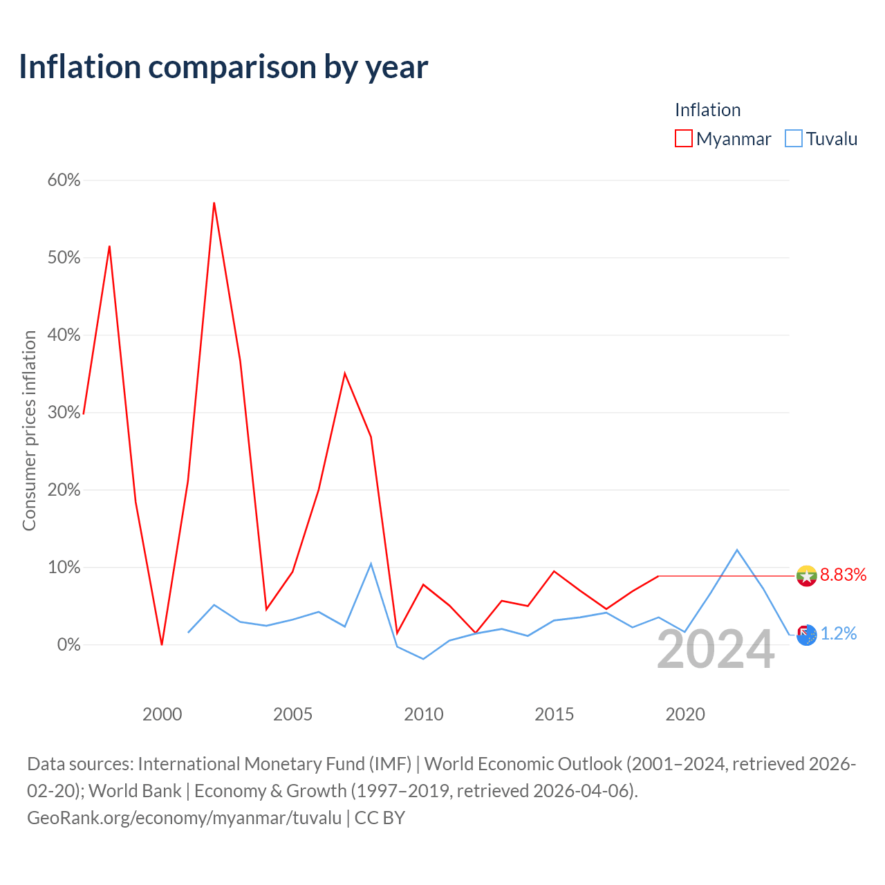 Over the past 19 years, Myanmar has recorded an average annual inflation rate of 14.4%, compared with 2.69% in Tuvalu. In 2019, inflation was 8.83% in Myanmar and 1.2% in Tuvalu.