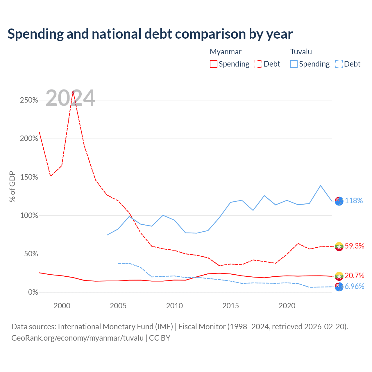 Myanmar has $44B in government debt (59.3% of GDP), compared to $4.15M (6.96% of GDP) in Tuvalu.