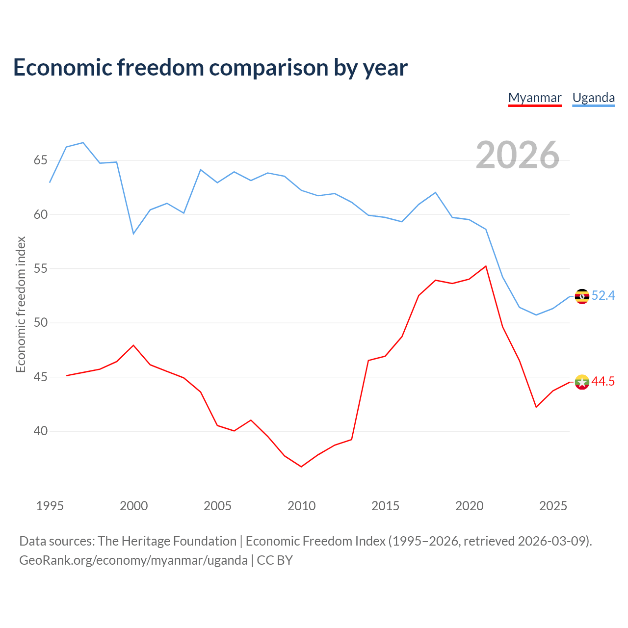 The Economic Freedom Index for Myanmar is 44.5, ranking 180/197, compared to 52.4 for Uganda, ranking 149/197. The chart above displays a comparison of annual changes in economic freedom indexes.