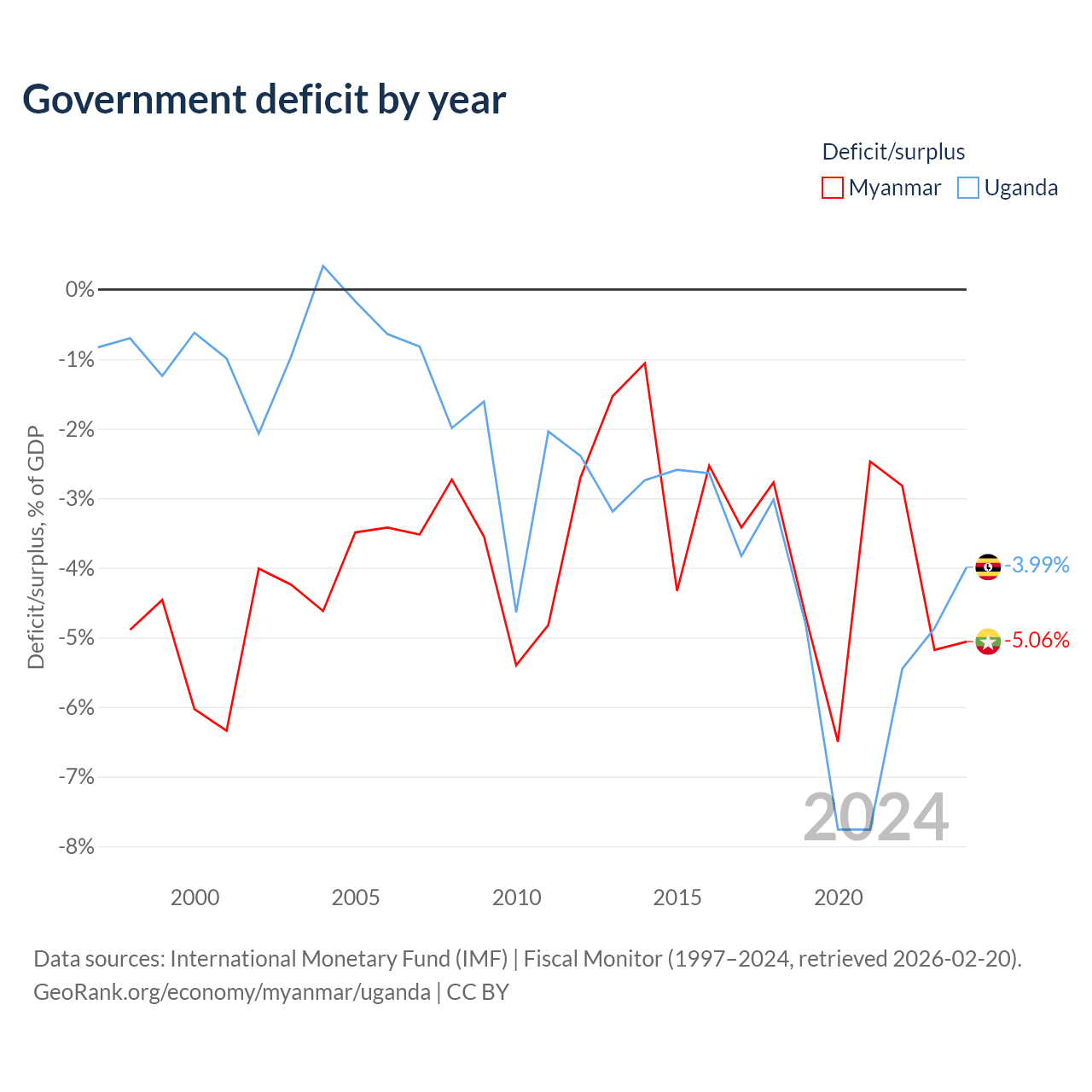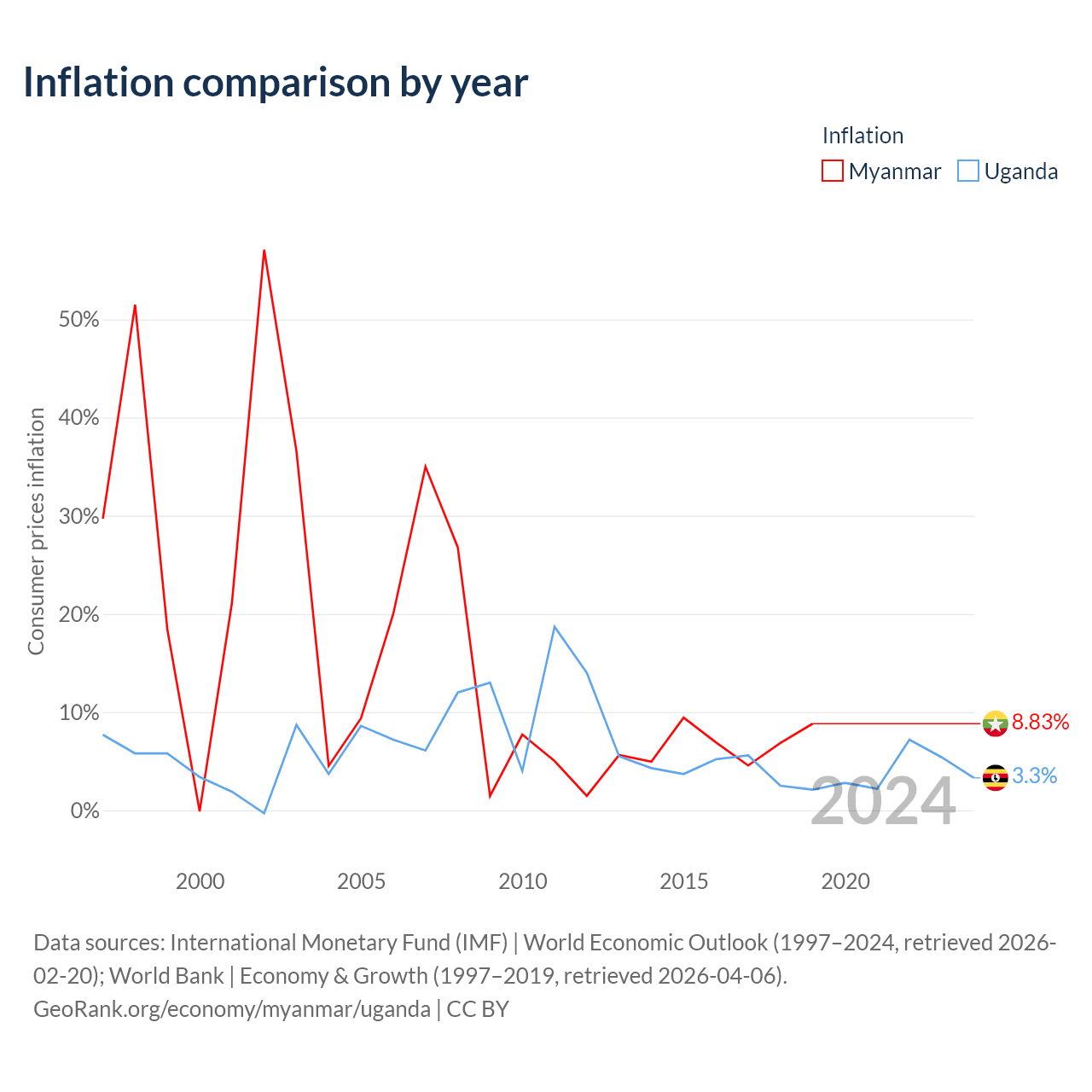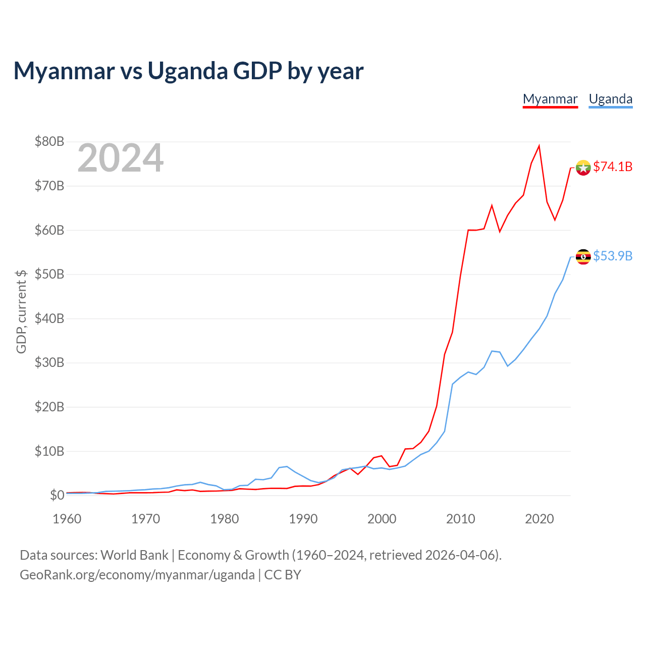 Myanmar has a GDP of $74.1B compared to $53.9B for Uganda, ranking 85/197 and 89/197 by economy size, respectively.