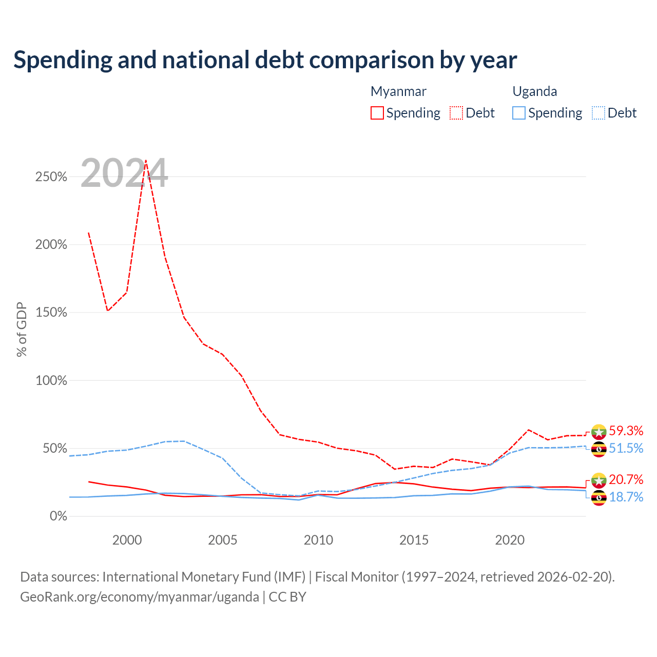 Myanmar has $44B in government debt (59.3% of GDP), compared to $27.8B (51.5% of GDP) in Uganda.