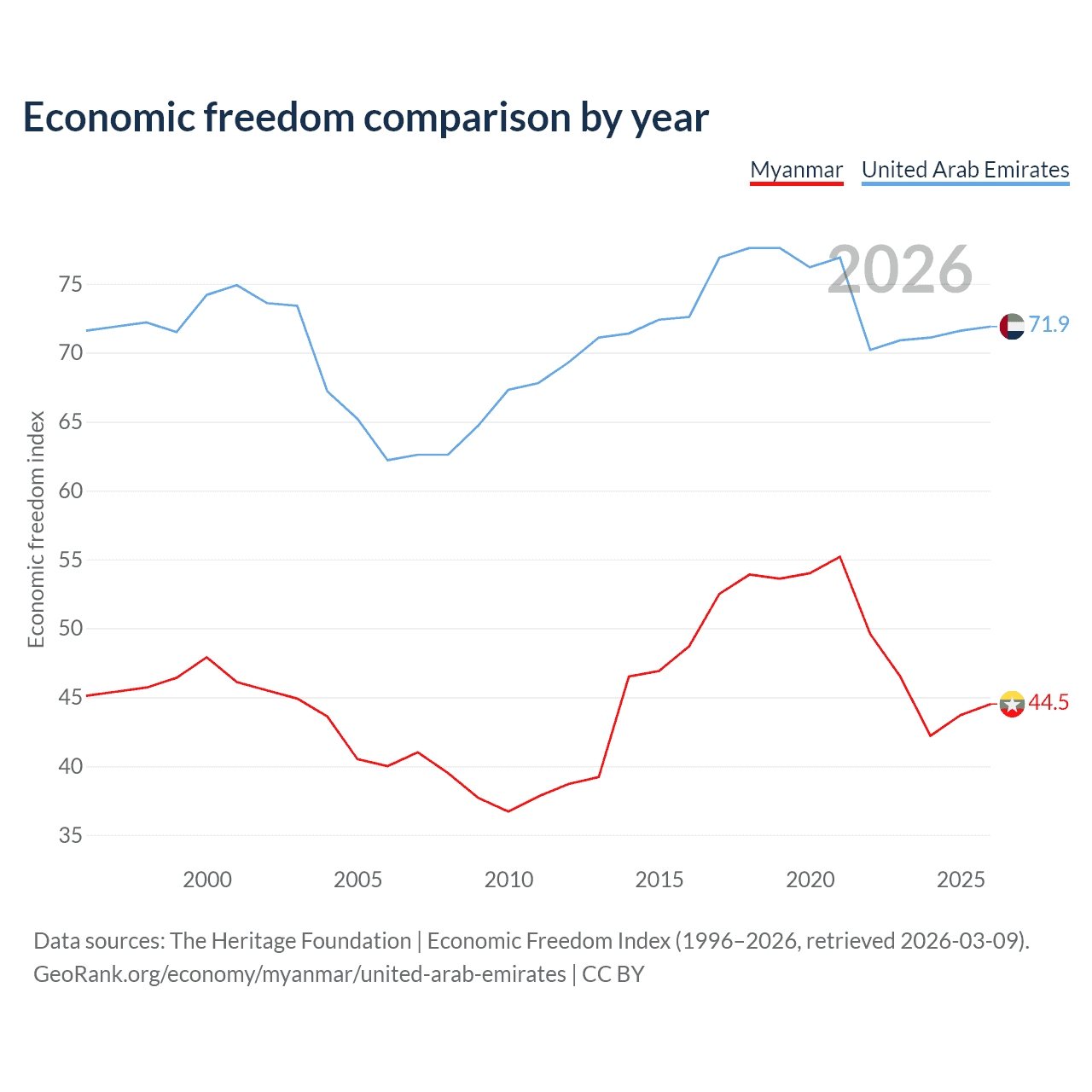 Data sources: The Heritage Foundation | Economic Freedom Index (1996–2026, retrieved 2026-03-09).