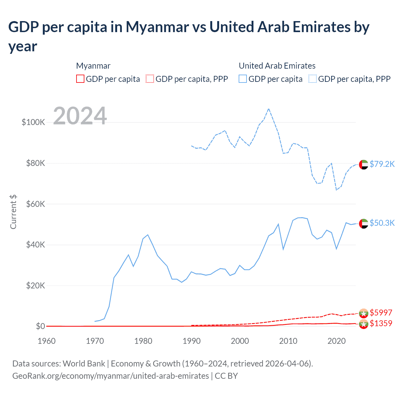 GDP per capita in Myanmar vs United Arab Emirates by year