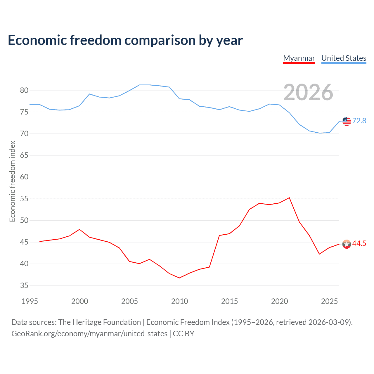 The Economic Freedom Index for Myanmar is 44.5, ranking 180/197, compared to 72.8 for the United States, ranking 27/197. The chart above displays a comparison of annual changes in economic freedom indexes.