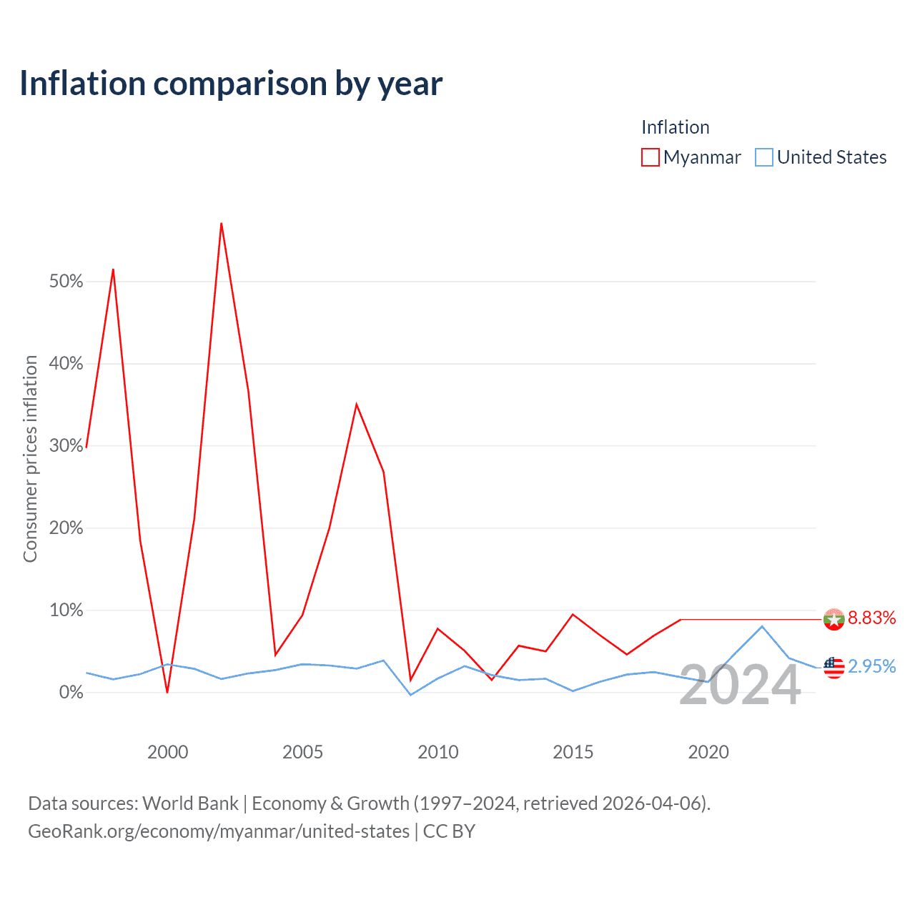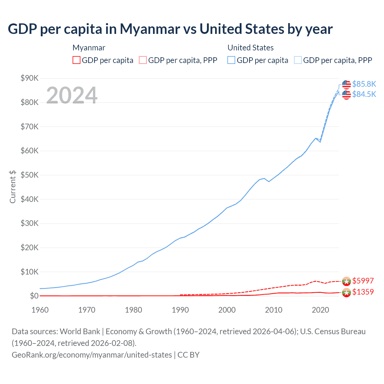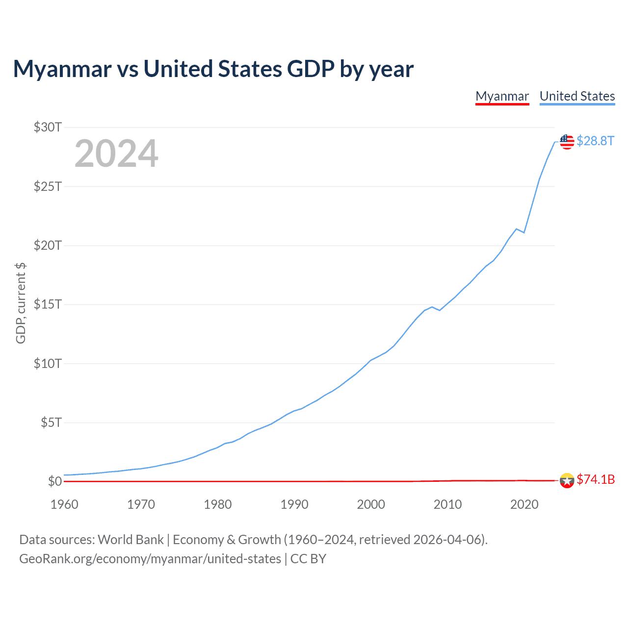 Myanmar has a GDP of $74.1B compared to $28.8T for the United States, ranking 85/197 and 1/197 by economy size, respectively.