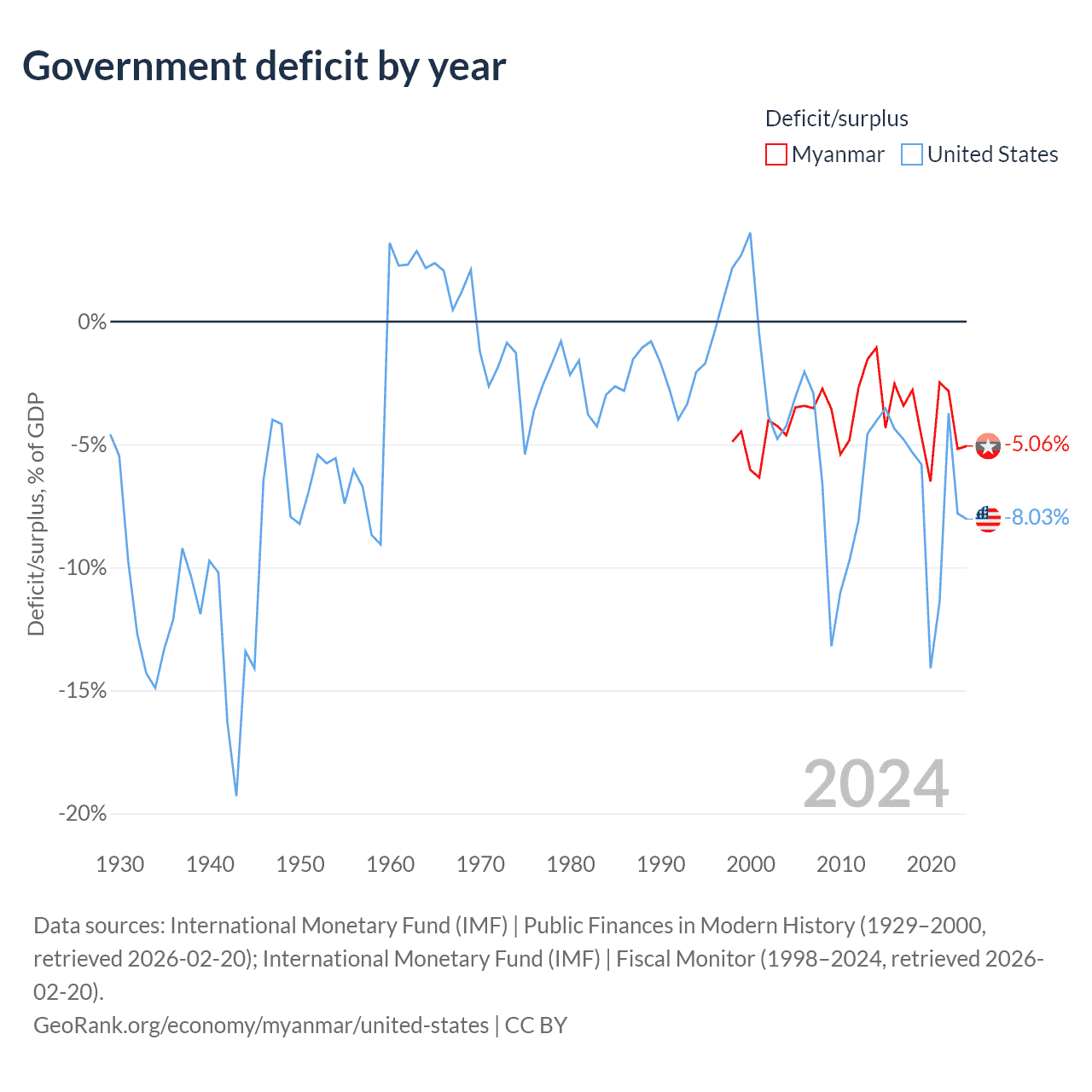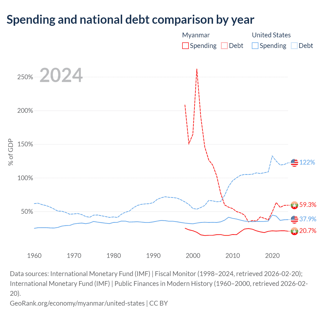 Myanmar has $44B in government debt (59.3% of GDP), compared to $35.2T (122.3% of GDP) in the United States.