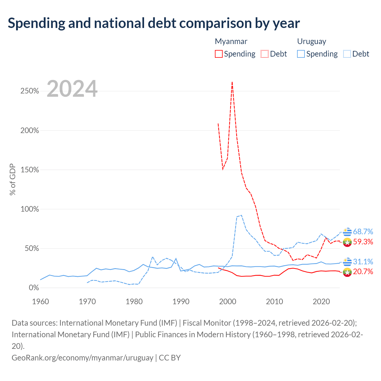 Myanmar has $44B in government debt (59.3% of GDP), compared to $55.6B (68.7% of GDP) in Uruguay.