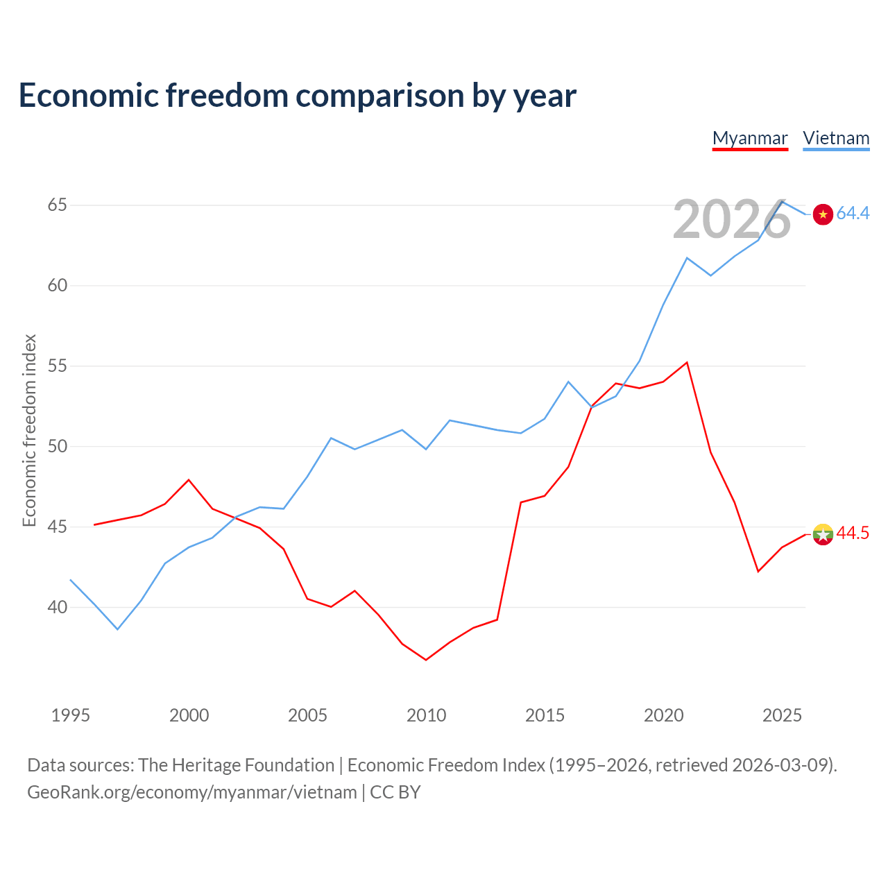 The Economic Freedom Index for Myanmar is 44.5, ranking 180/197, compared to 64.4 for Vietnam, ranking 73/197. The chart above displays a comparison of annual changes in economic freedom indexes.