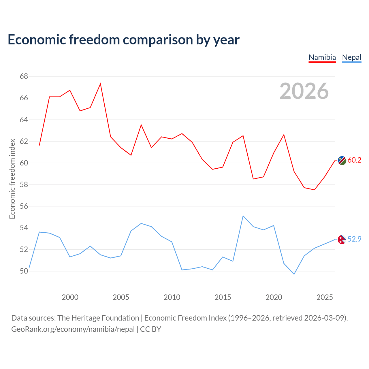 The Economic Freedom Index for Namibia is 60.2, ranking 95/197, compared to 52.9 for Nepal, ranking 144/197. The chart above displays a comparison of annual changes in economic freedom indexes.