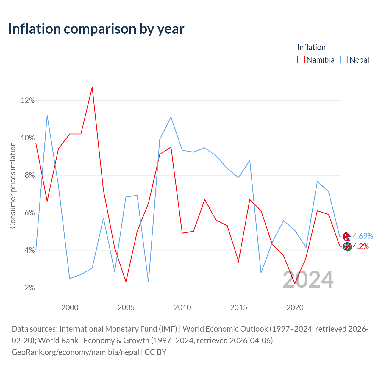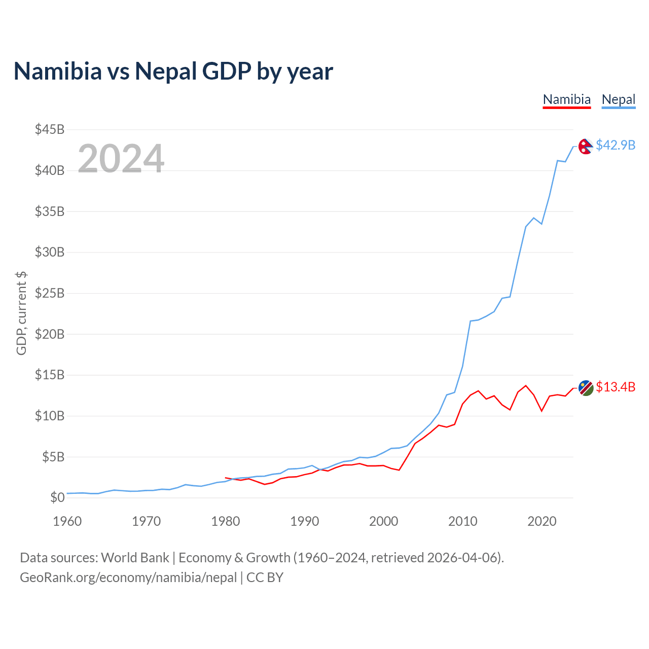 Namibia has a GDP of $13.4B compared to $42.9B for Nepal, ranking 147/197 and 101/197 by economy size, respectively.