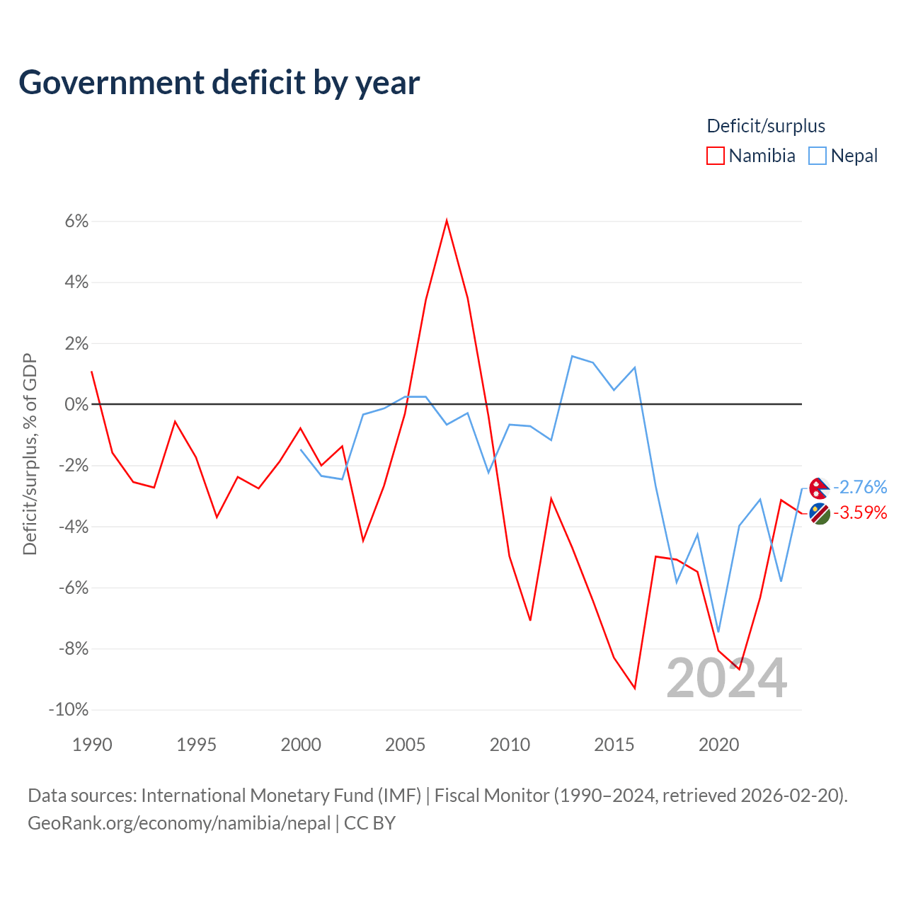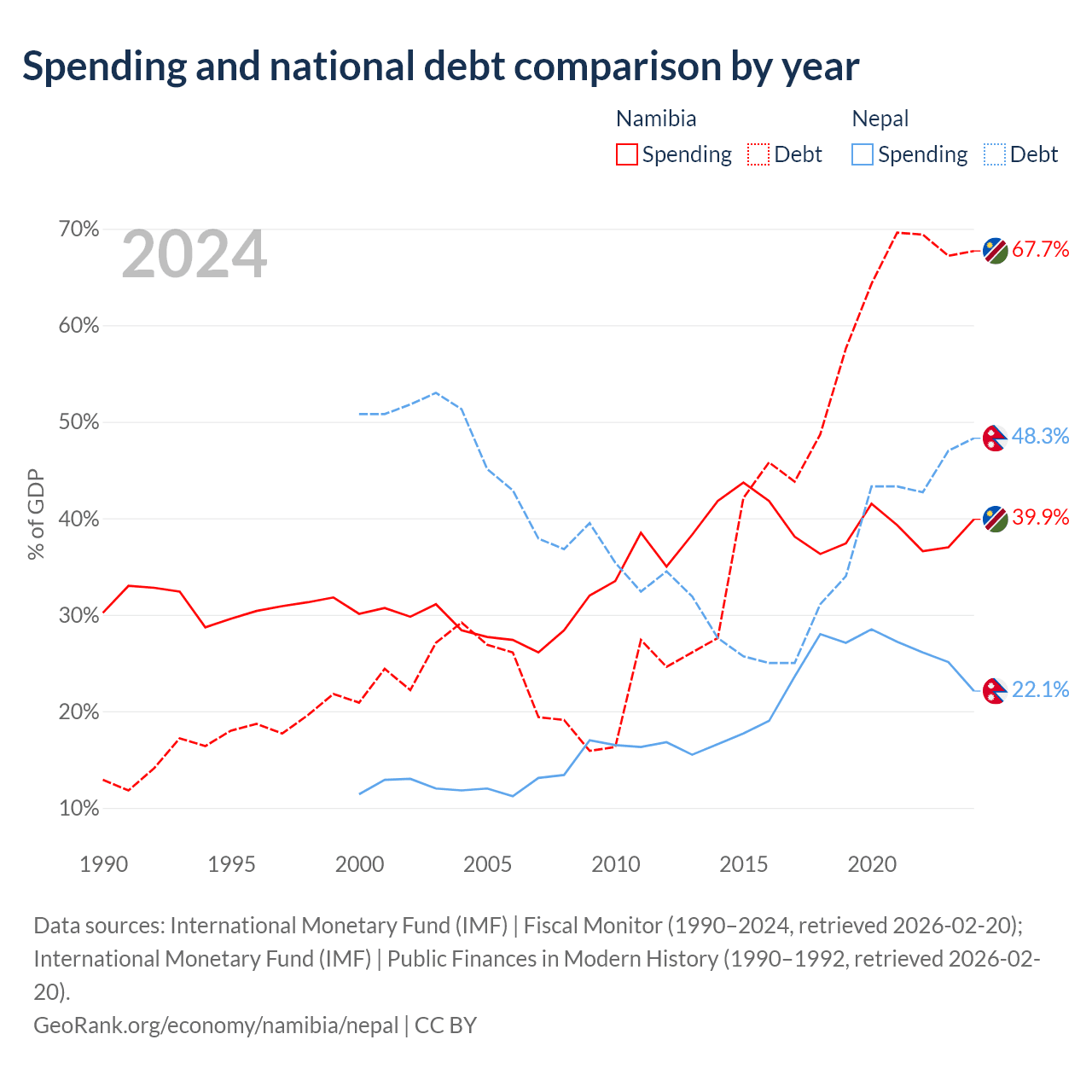 Namibia has $9.05B in government debt (67.7% of GDP), compared to $20.7B (48.3% of GDP) in Nepal.