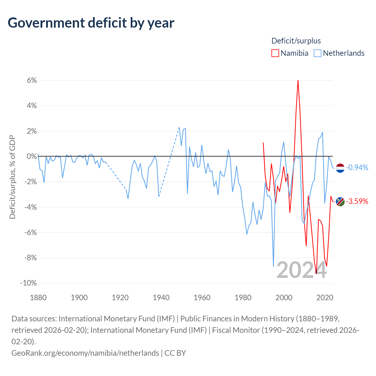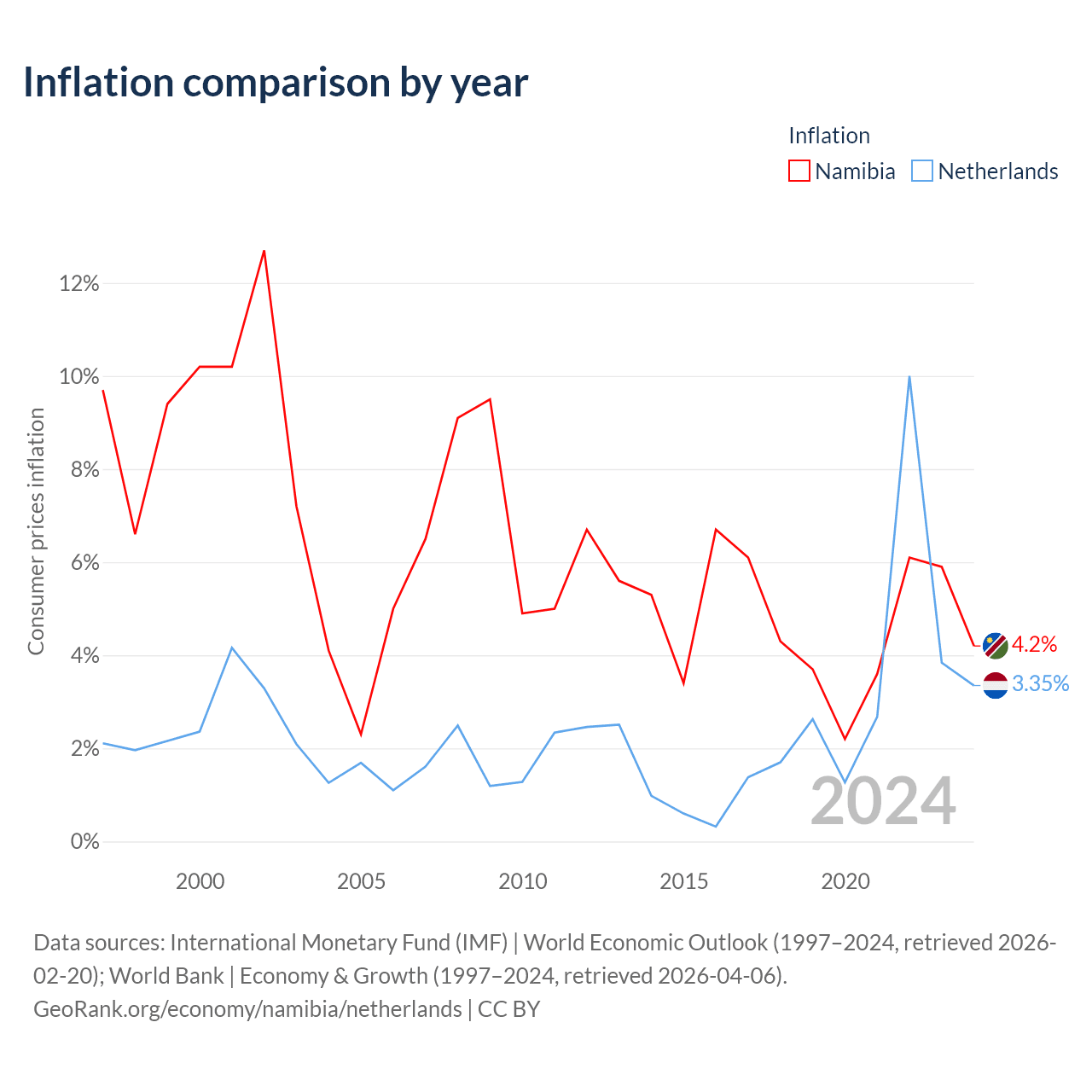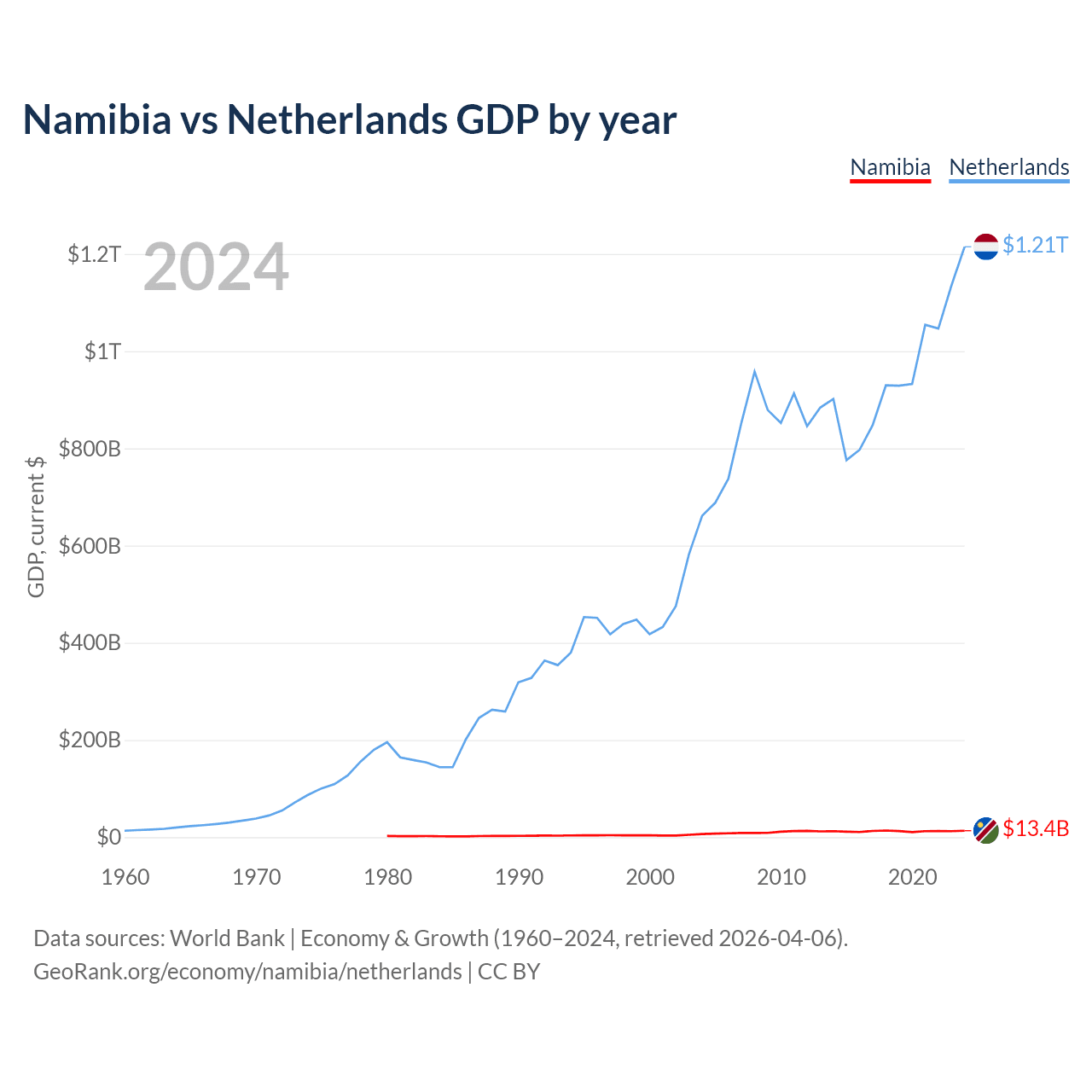 Namibia has a GDP of $13.4B compared to $1.21T for the Netherlands, ranking 147/197 and 19/197 by economy size, respectively.