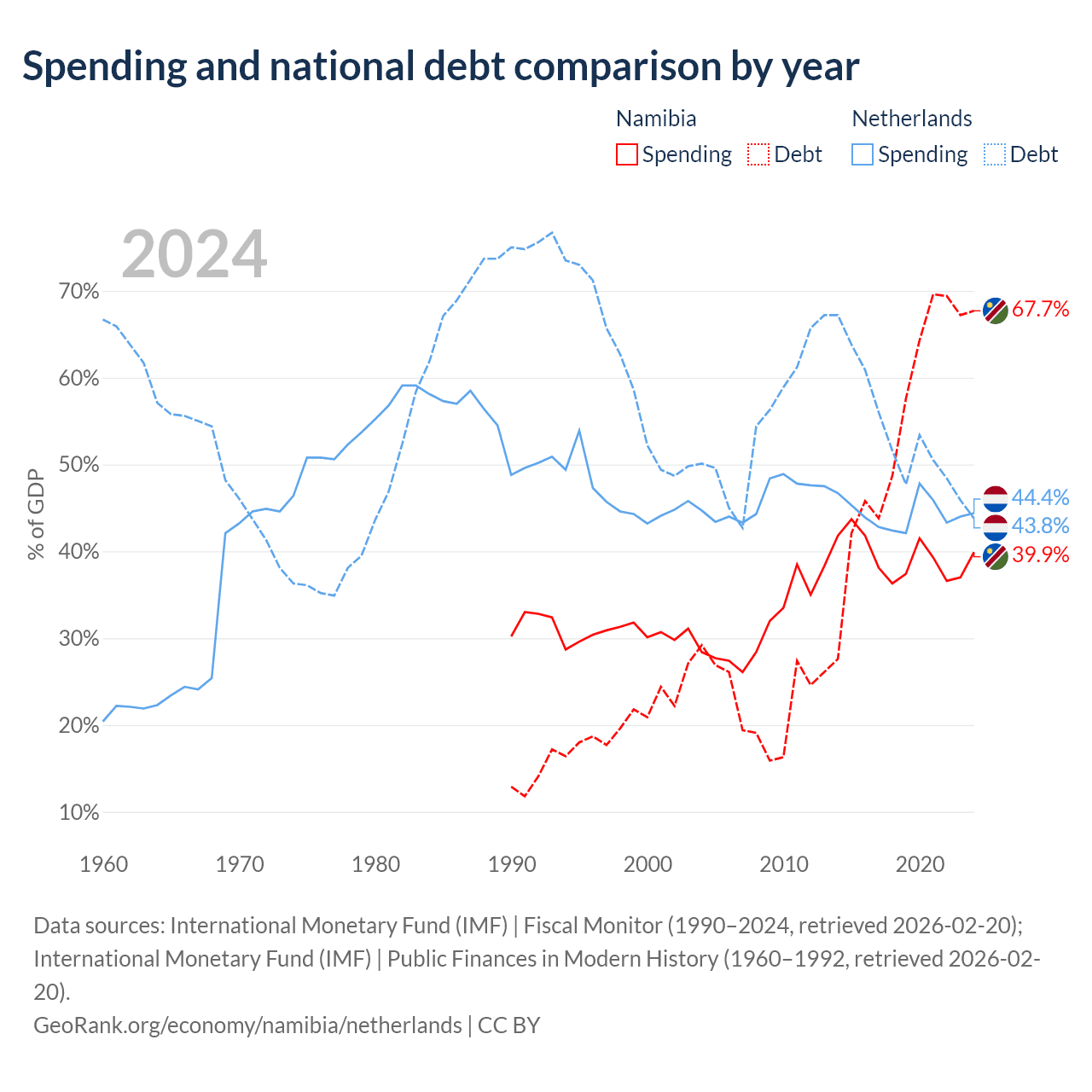 Namibia has $9.05B in government debt (67.7% of GDP), compared to $532B (43.8% of GDP) in the Netherlands.