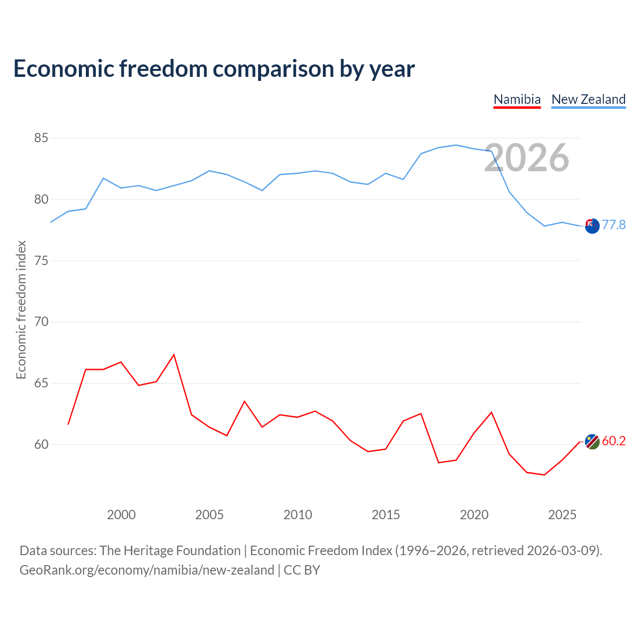 The Economic Freedom Index for Namibia is 60.2, ranking 95/197, compared to 77.8 for New Zealand, ranking 13/197. The chart above displays a comparison of annual changes in economic freedom indexes.