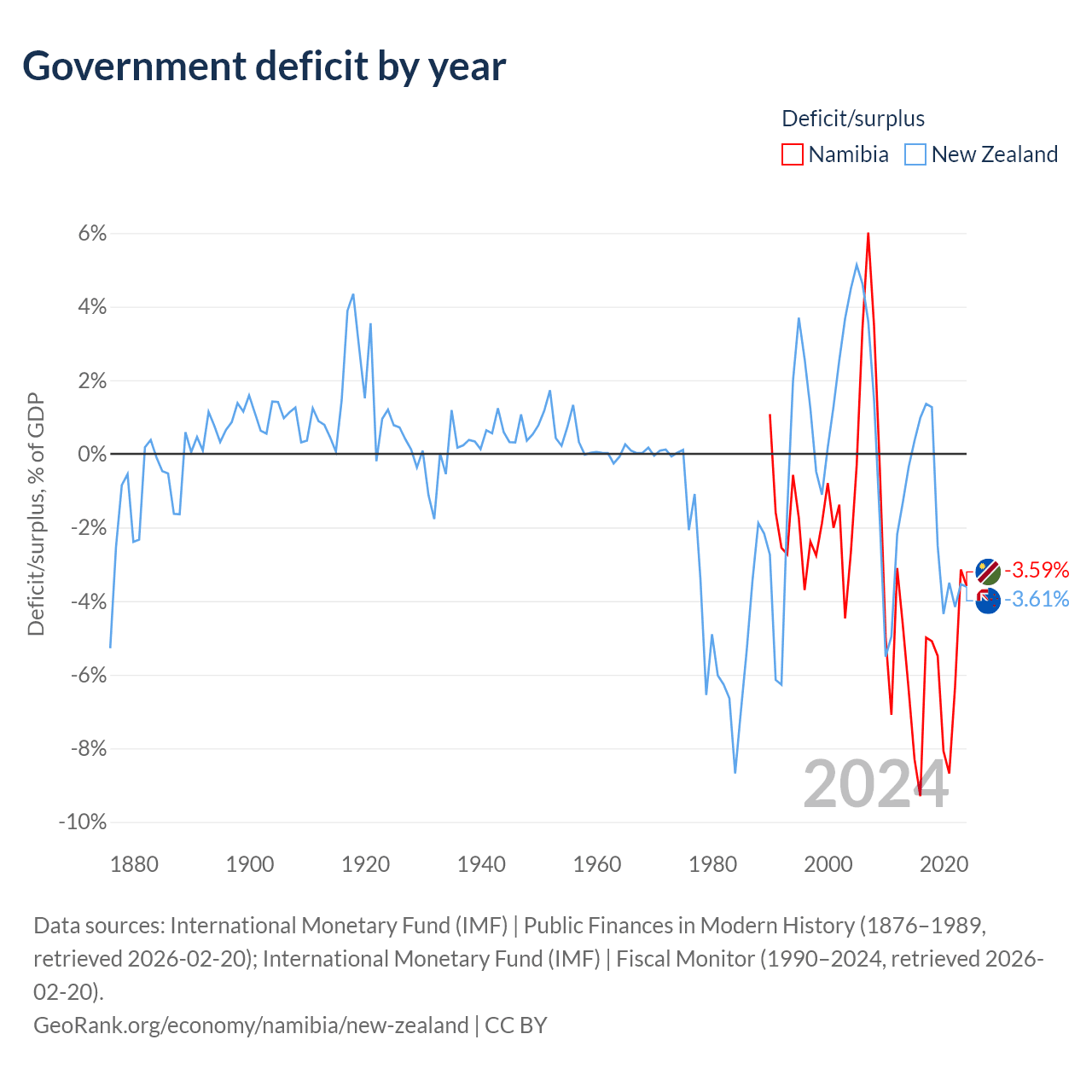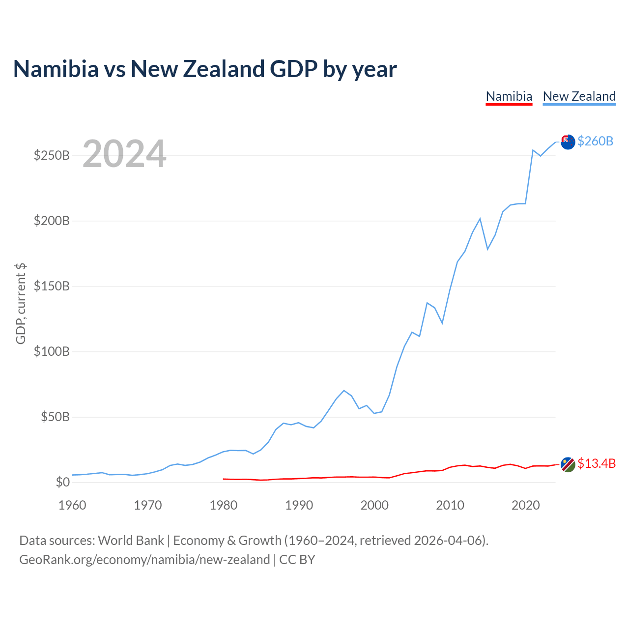 Namibia has a GDP of $13.4B compared to $260B for New Zealand, ranking 147/197 and 52/197 by economy size, respectively.