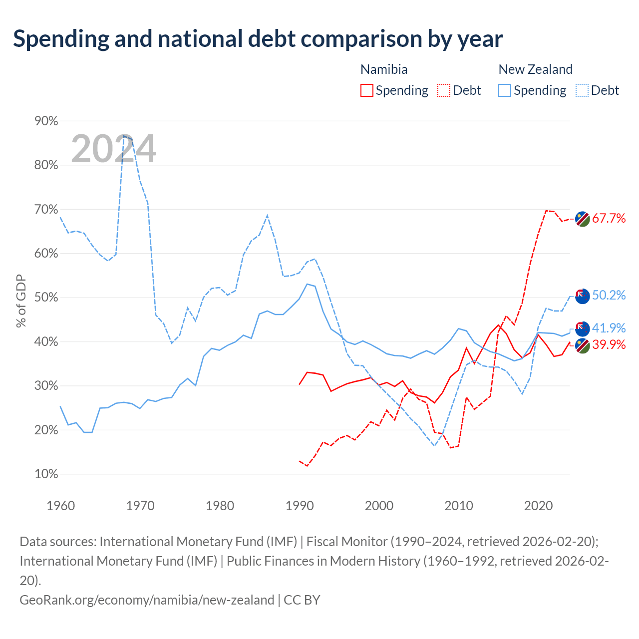 Namibia has $9.05B in government debt (67.7% of GDP), compared to $131B (50.2% of GDP) in New Zealand.