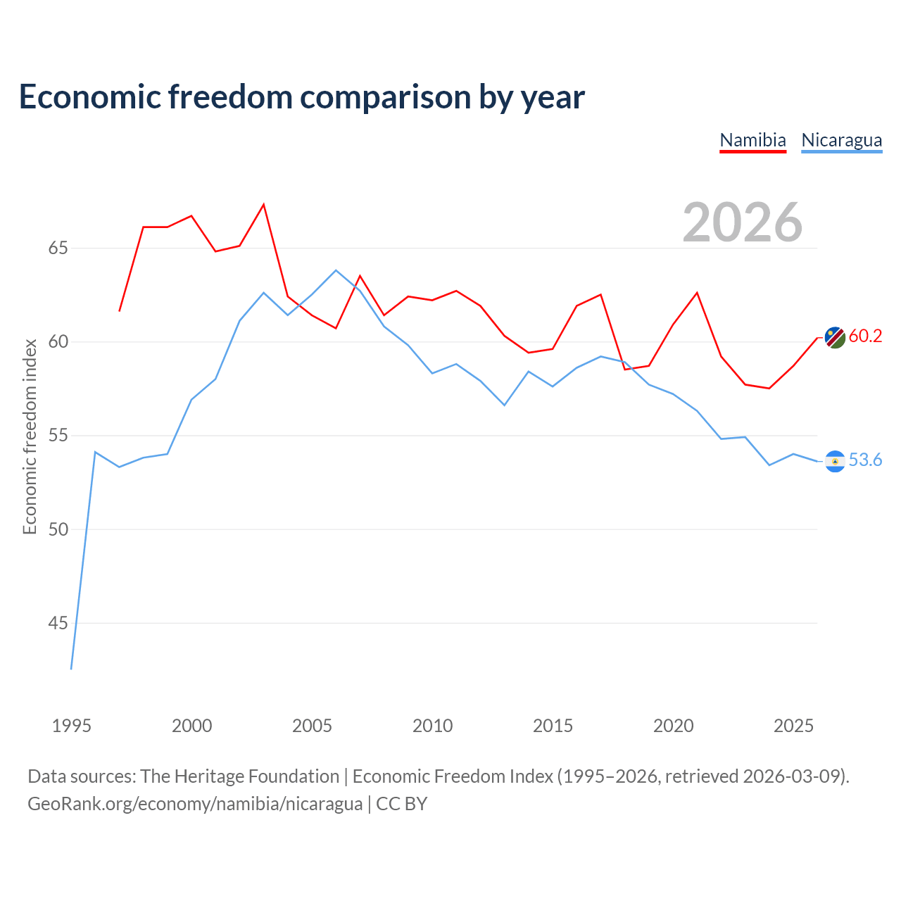 Data sources: The Heritage Foundation | Economic Freedom Index (1995–2026, retrieved 2026-03-09).