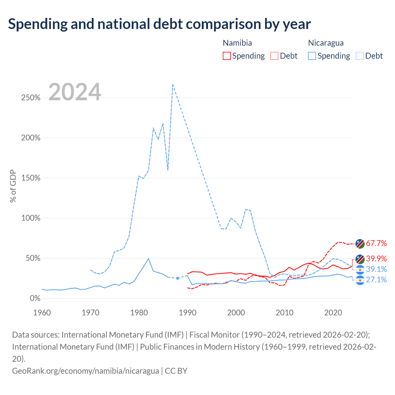 Namibia has $9.05B in government debt (67.7% of GDP), compared to $7.71B (39.1% of GDP) in Nicaragua.