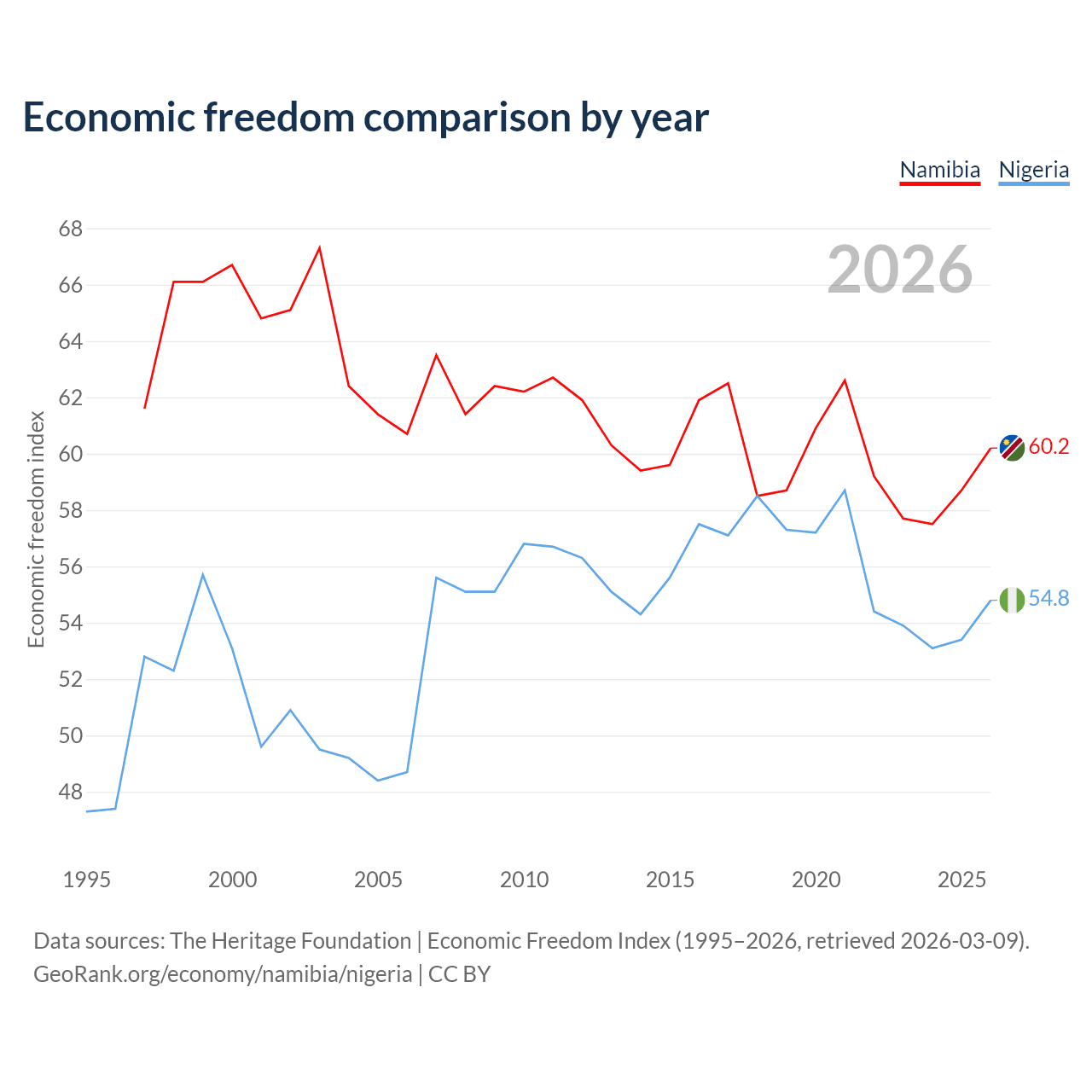 The Economic Freedom Index for Namibia is 60.2, ranking 95/197, compared to 54.8 for Nigeria, ranking 132/197. The chart above displays a comparison of annual changes in economic freedom indexes.