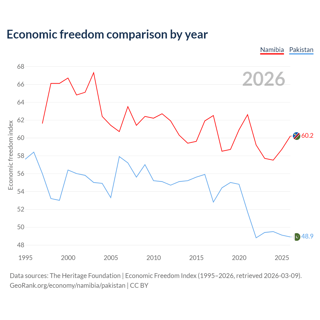 The Economic Freedom Index for Namibia is 60.2, ranking 95/197, compared to 48.9 for Pakistan, ranking 168/197. The chart above displays a comparison of annual changes in economic freedom indexes.