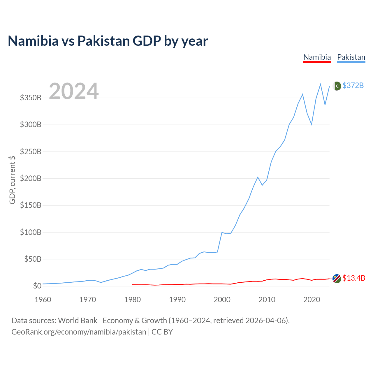 Namibia has a GDP of $13.4B compared to $372B for Pakistan, ranking 147/197 and 43/197 by economy size, respectively.