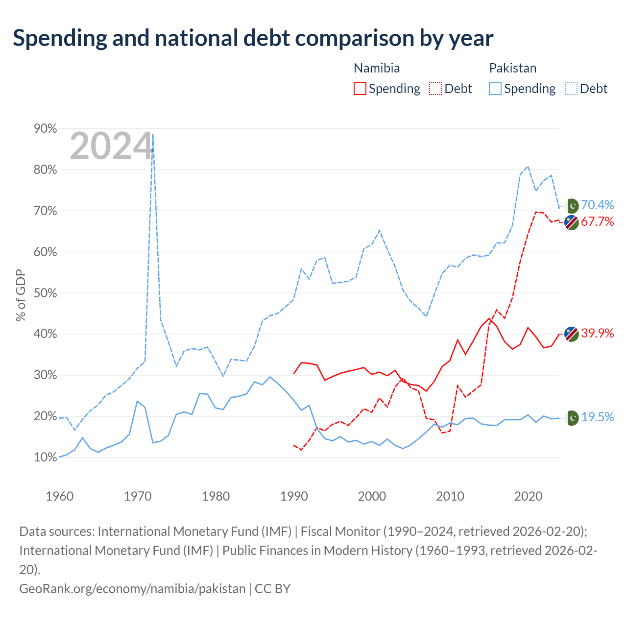 Namibia has $9.05B in government debt (67.7% of GDP), compared to $262B (70.4% of GDP) in Pakistan.