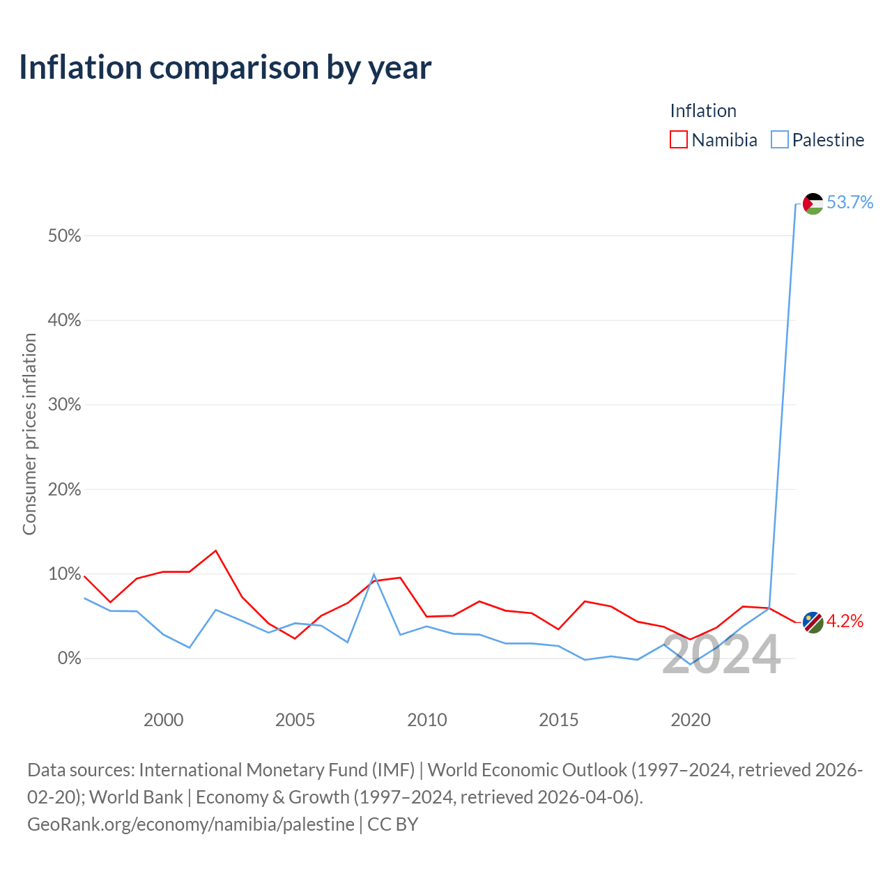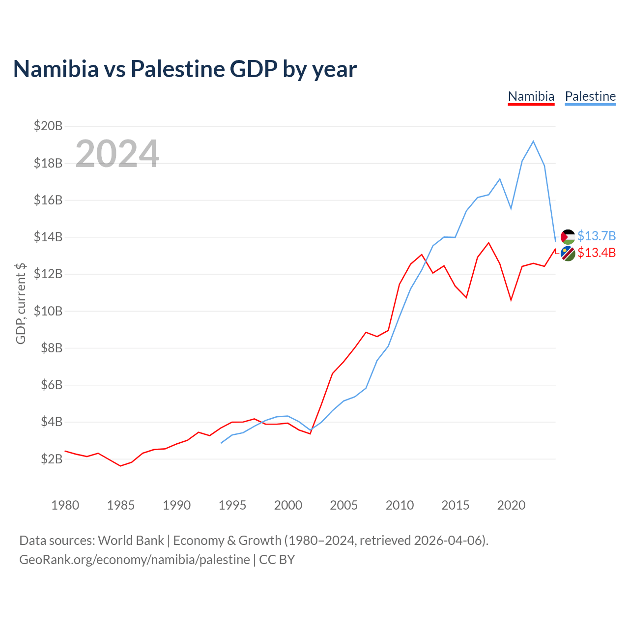 Namibia has a GDP of $13.4B compared to $13.7B for Palestine, ranking 147/197 and 146/197 by economy size, respectively.