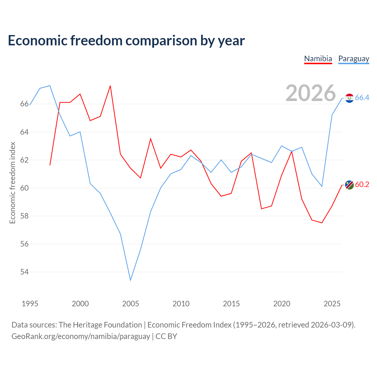 The Economic Freedom Index for Namibia is 60.2, ranking 95/197, compared to 66.4 for Paraguay, ranking 61/197. The chart above displays a comparison of annual changes in economic freedom indexes.