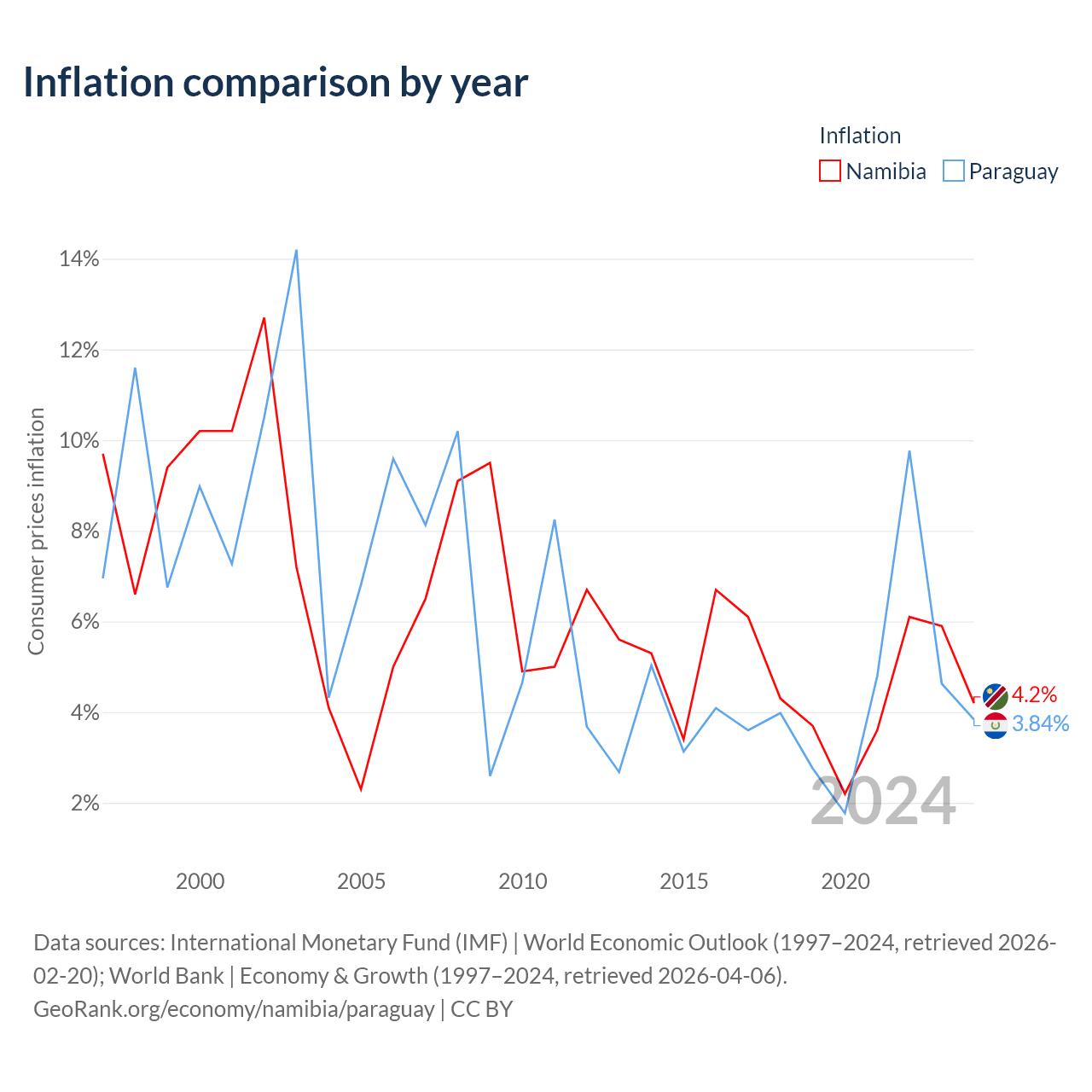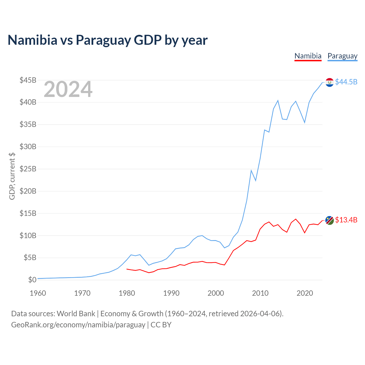Namibia has a GDP of $13.4B compared to $44.5B for Paraguay, ranking 147/197 and 98/197 by economy size, respectively.