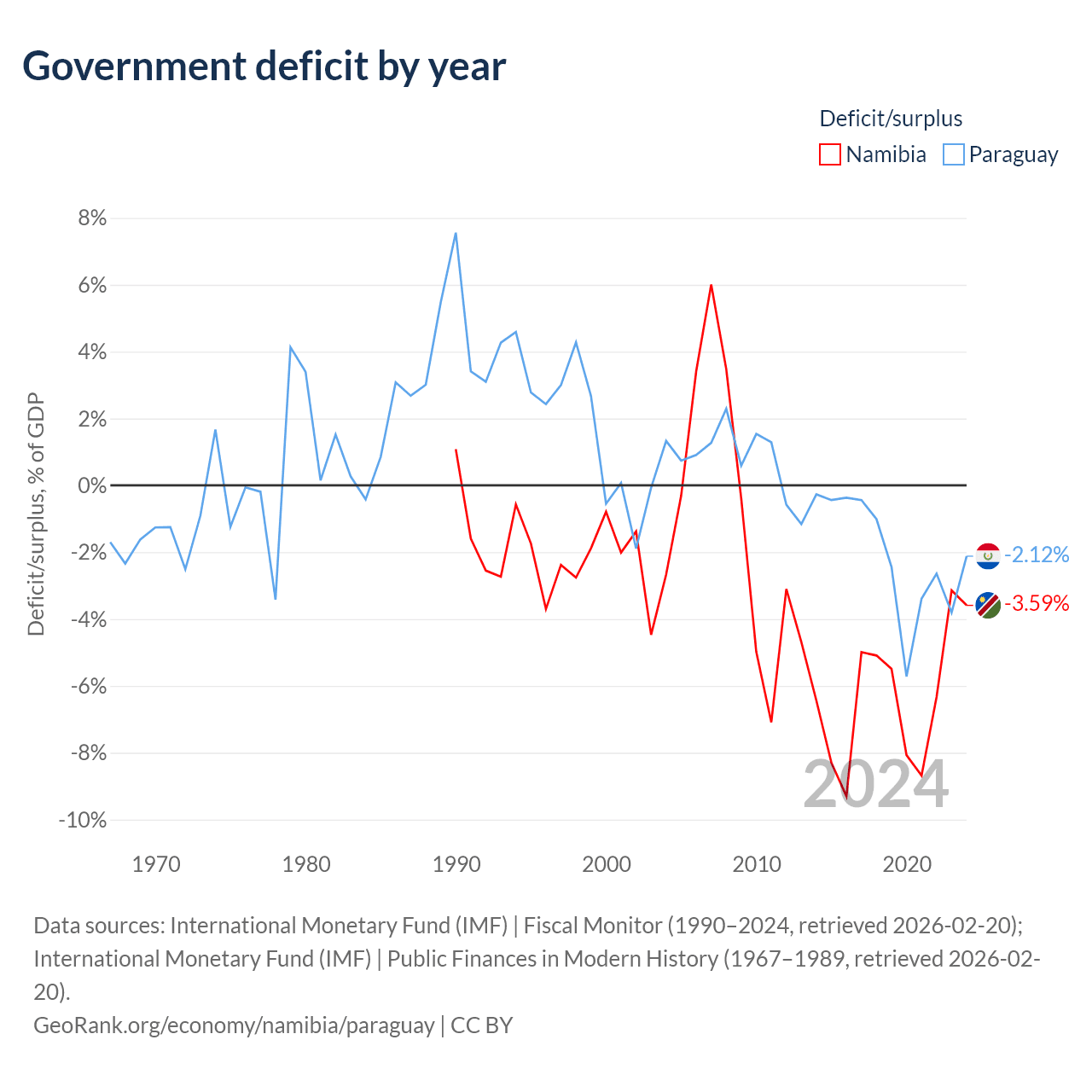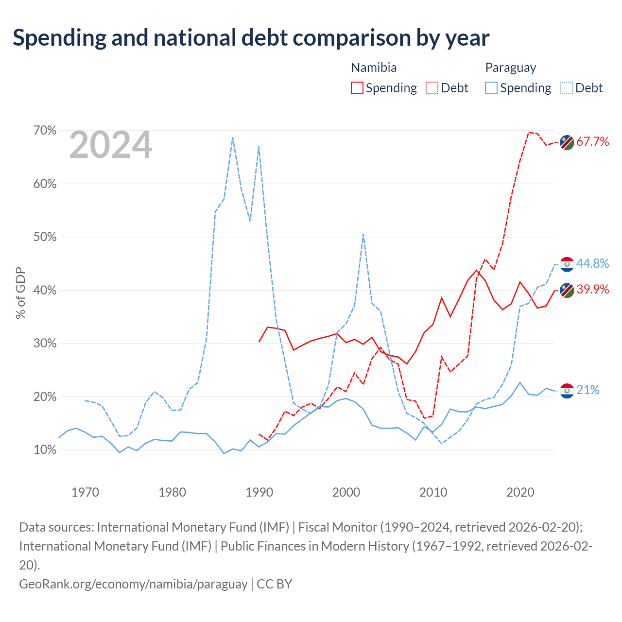 Namibia has $9.05B in government debt (67.7% of GDP), compared to $19.9B (44.8% of GDP) in Paraguay.