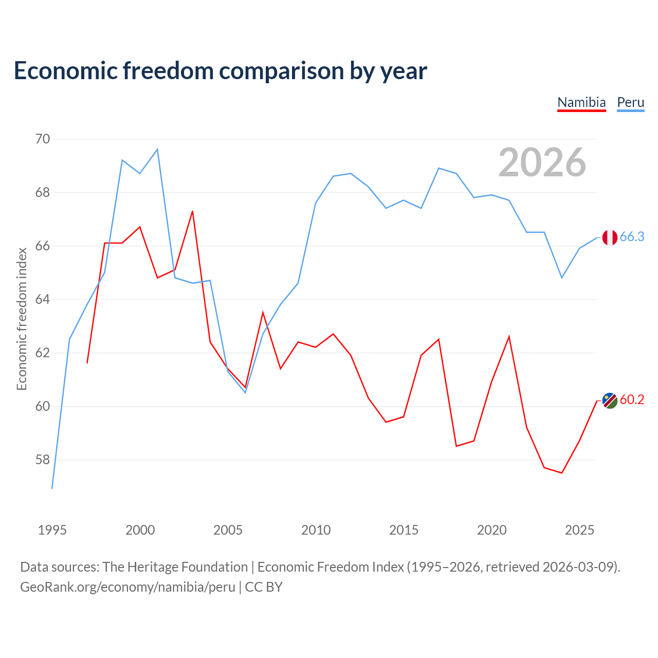 The Economic Freedom Index for Namibia is 60.2, ranking 95/197, compared to 66.3 for Peru, ranking 62/197. The chart above displays a comparison of annual changes in economic freedom indexes.