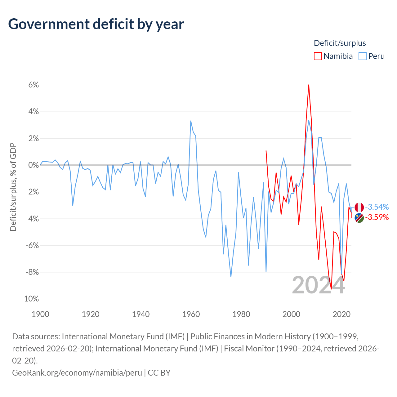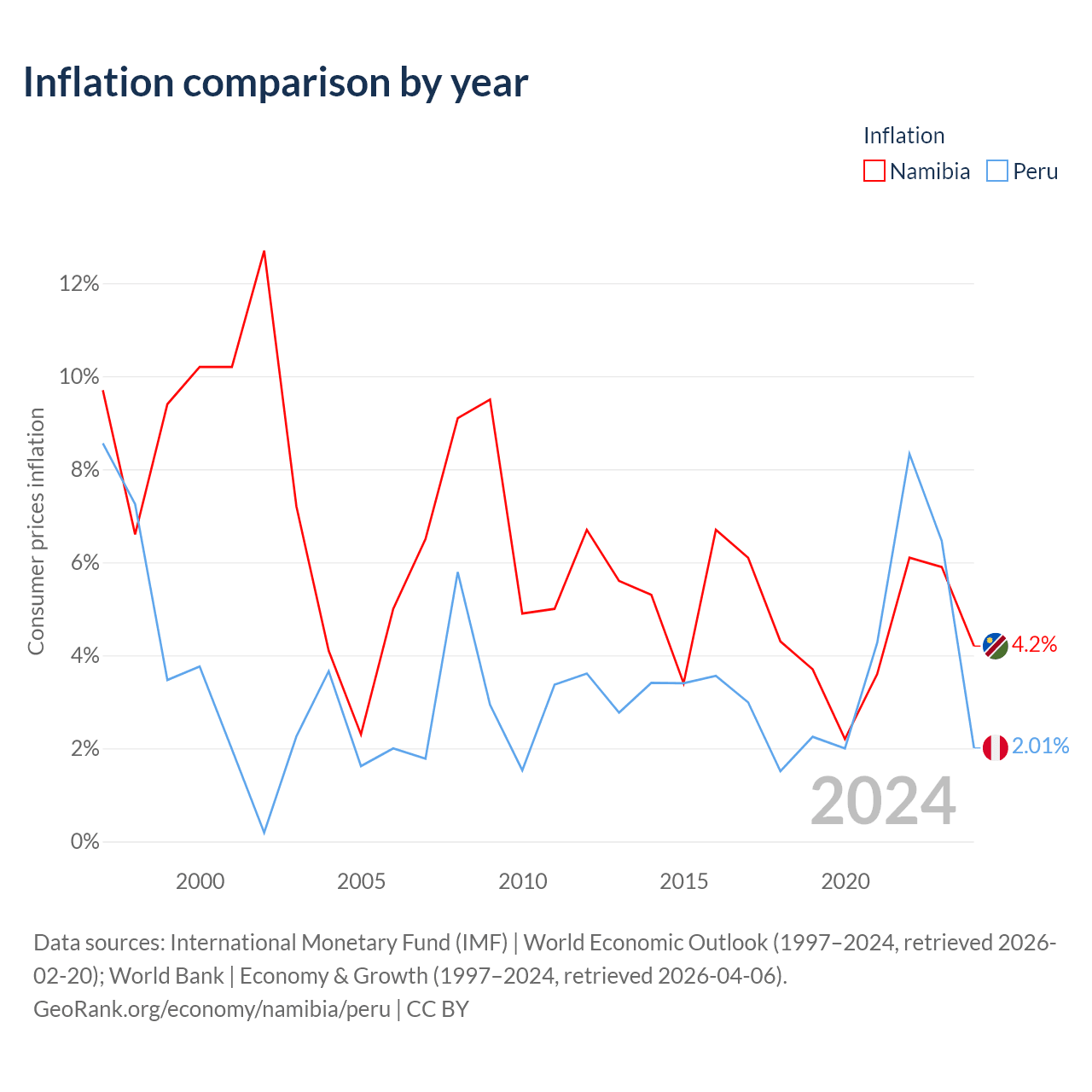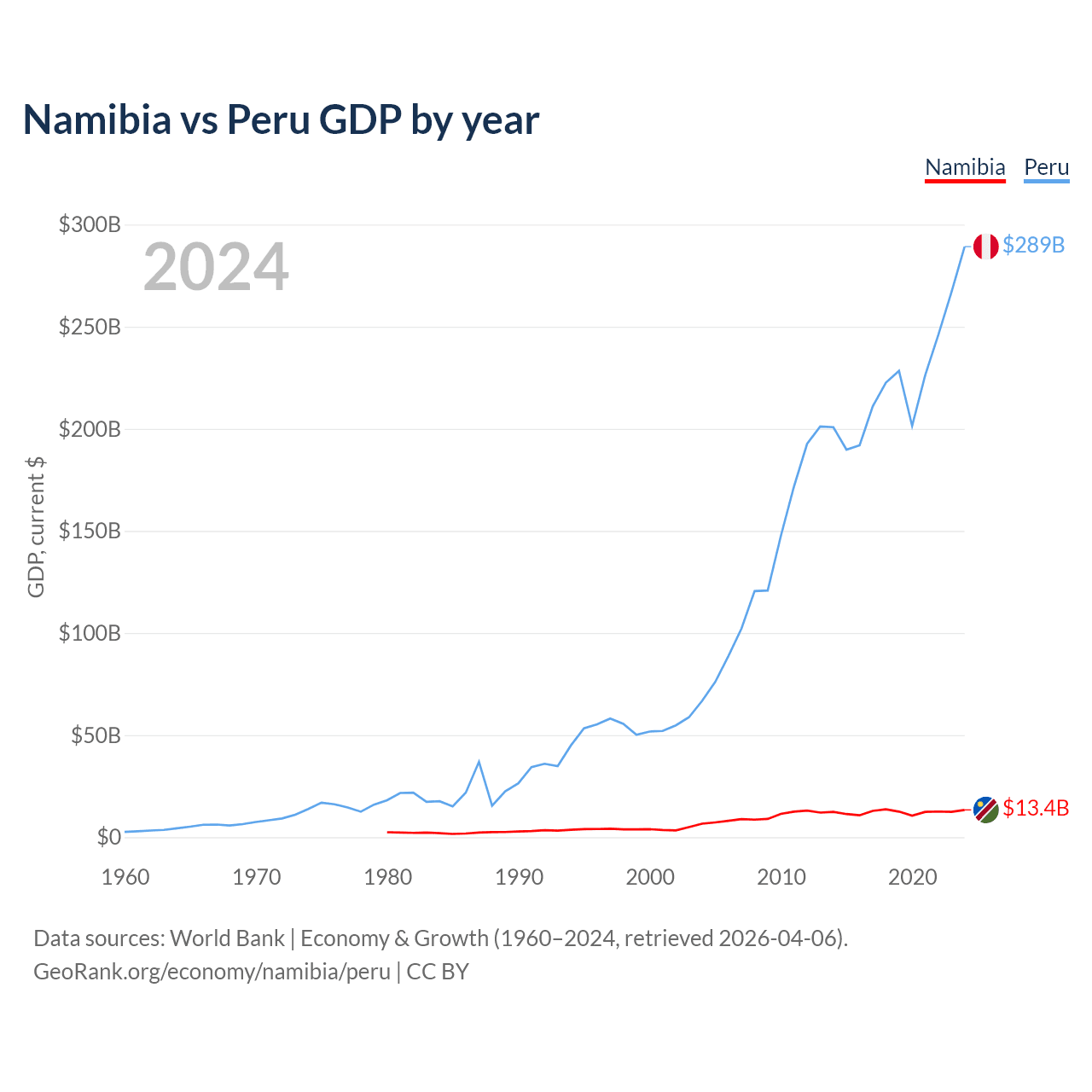 Namibia has a GDP of $13.4B compared to $289B for Peru, ranking 147/197 and 49/197 by economy size, respectively.