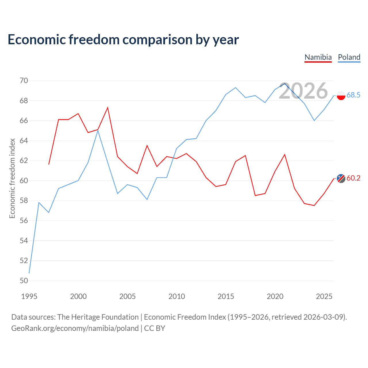 The Economic Freedom Index for Namibia is 60.2, ranking 95/197, compared to 68.5 for Poland, ranking 46/197. The chart above displays a comparison of annual changes in economic freedom indexes.