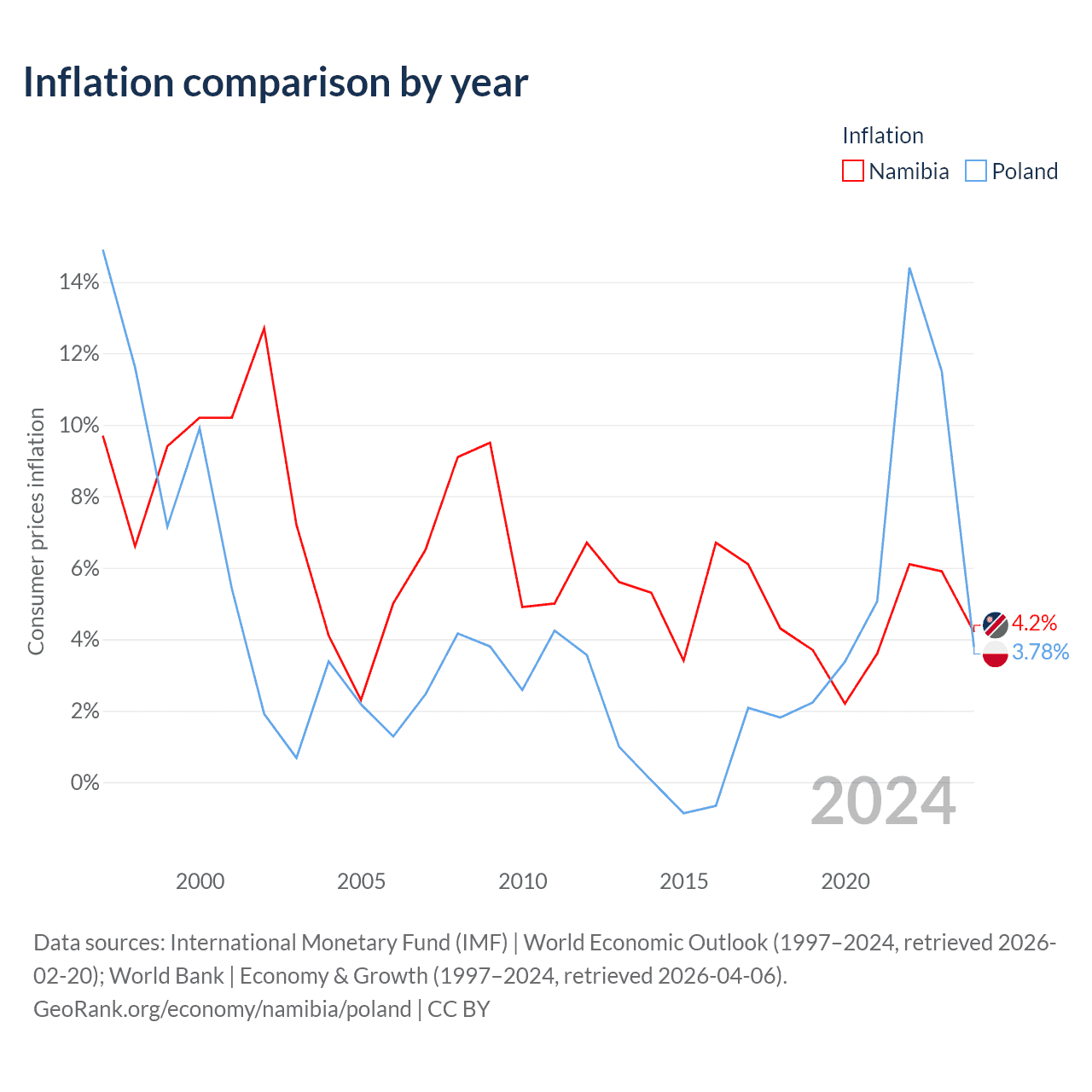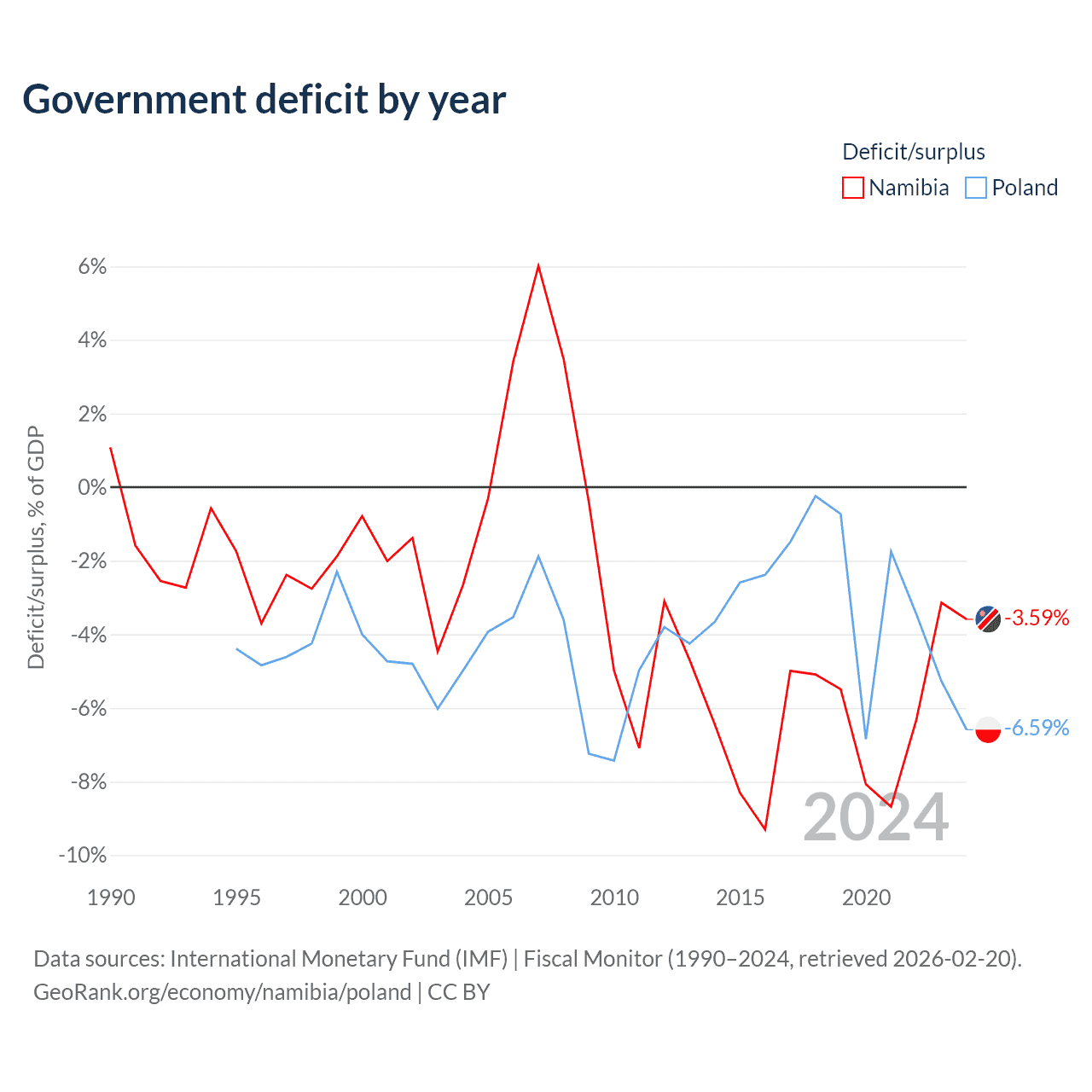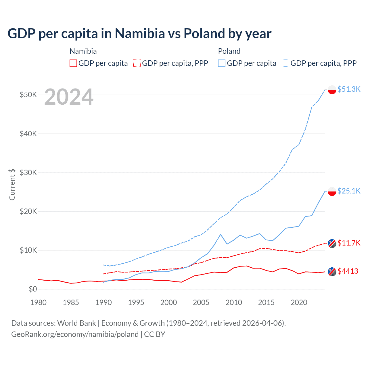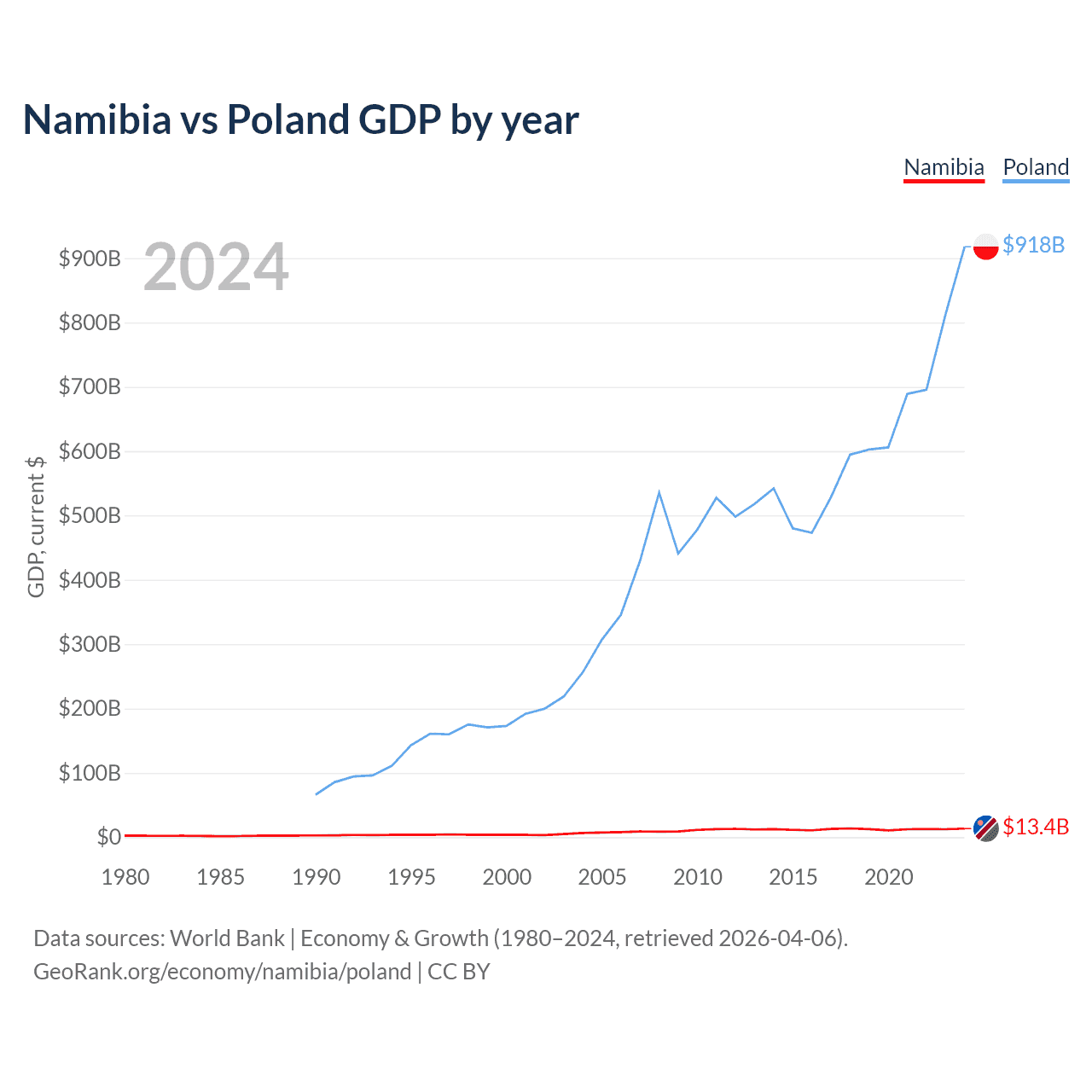 Namibia has a GDP of $13.4B compared to $918B for Poland, ranking 147/197 and 21/197 by economy size, respectively.