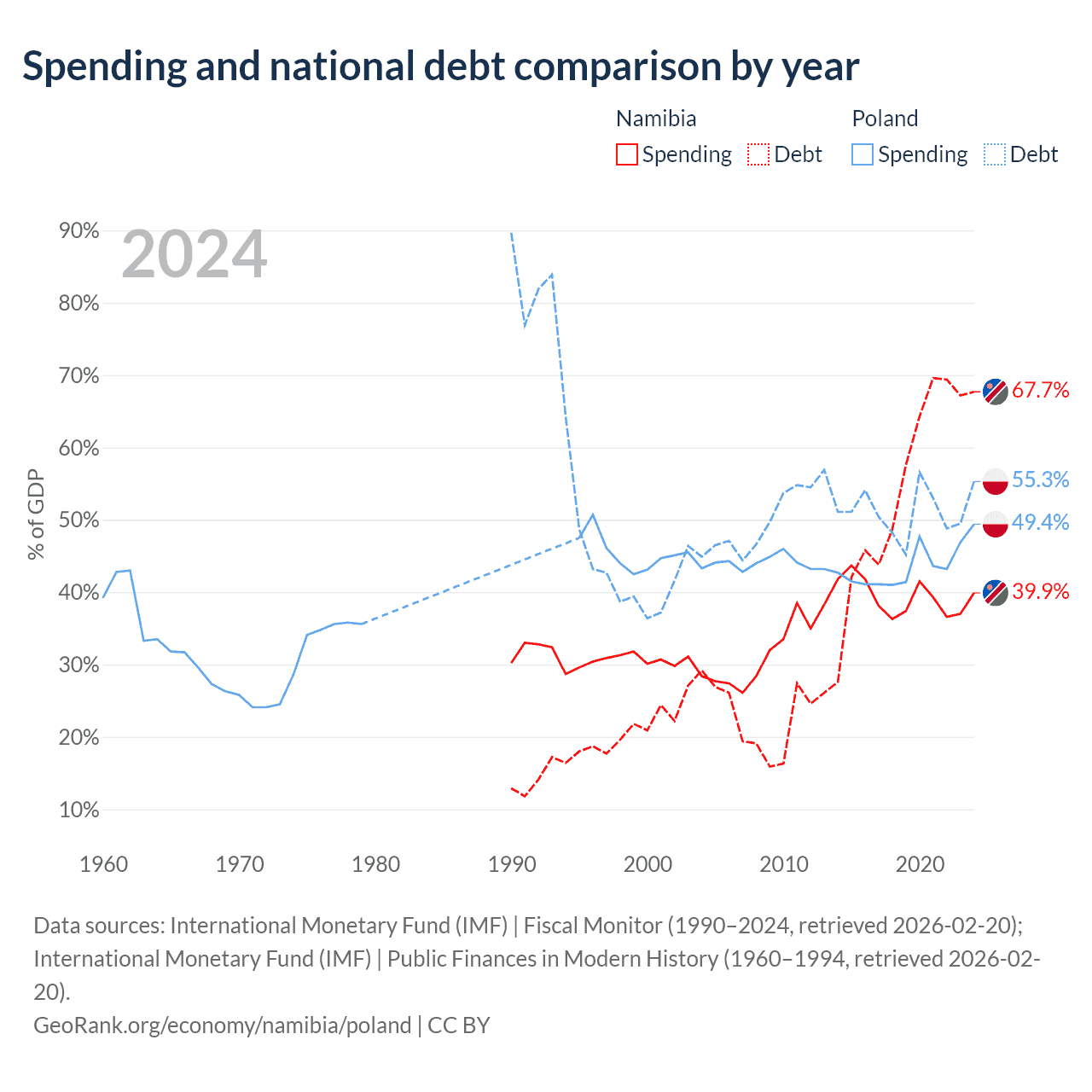Namibia has $9.05B in government debt (67.7% of GDP), compared to $507B (55.3% of GDP) in Poland.