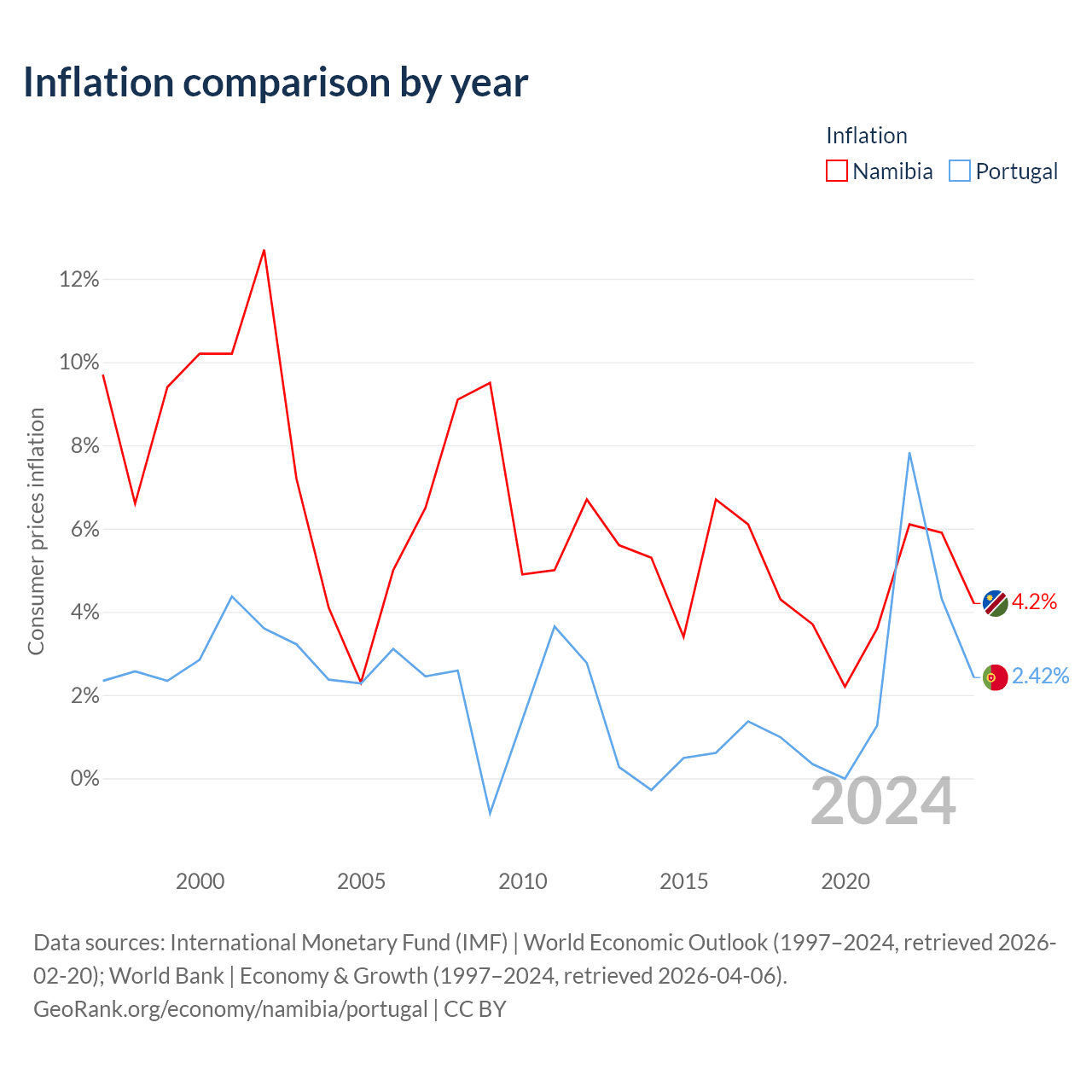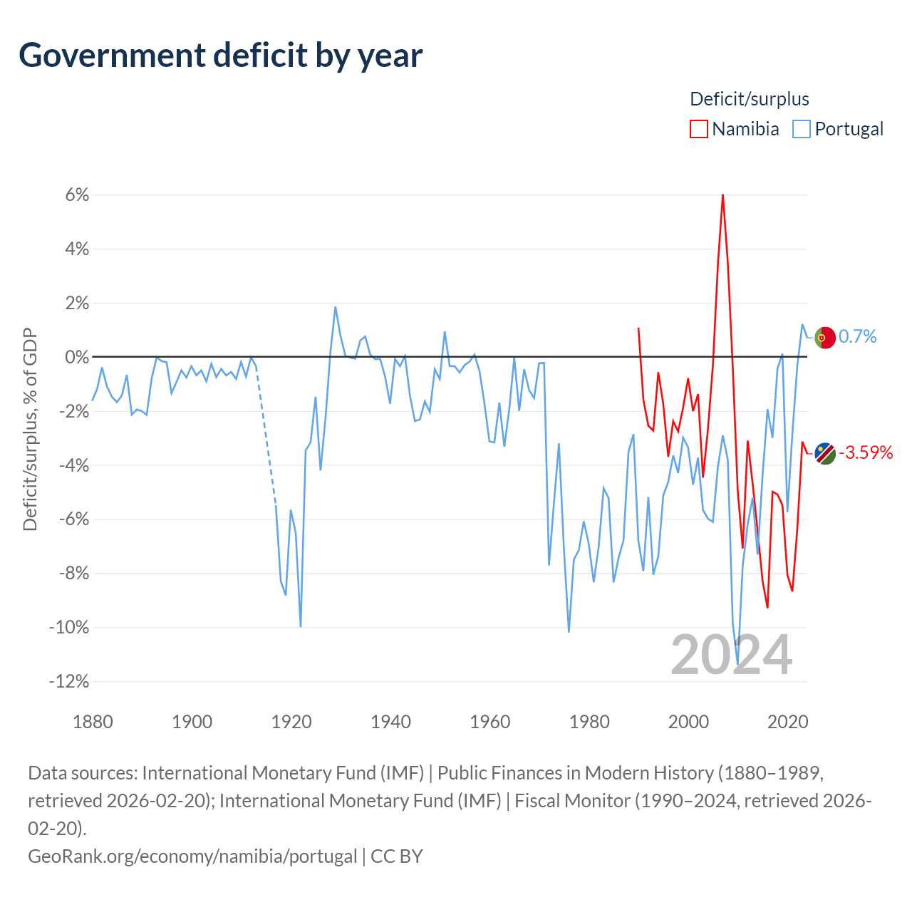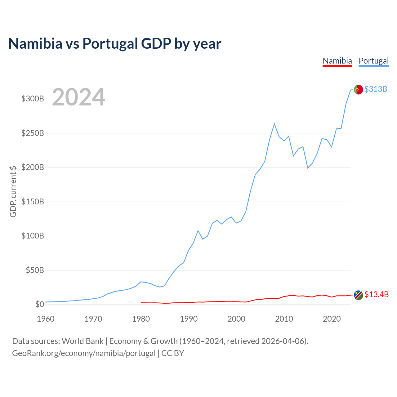 Namibia has a GDP of $13.4B compared to $313B for Portugal, ranking 147/197 and 46/197 by economy size, respectively.
