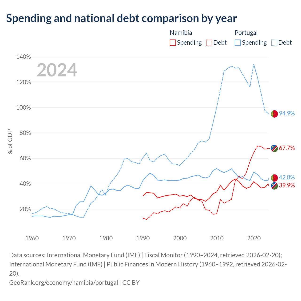 Namibia has $9.05B in government debt (67.7% of GDP), compared to $297B (94.9% of GDP) in Portugal.
