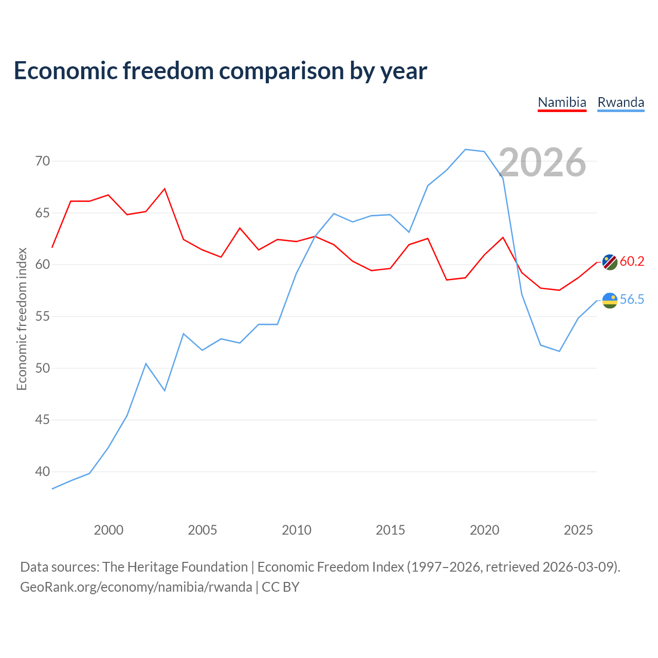 The Economic Freedom Index for Namibia is 60.2, ranking 95/197, compared to 56.5 for Rwanda, ranking 121/197. The chart above displays a comparison of annual changes in economic freedom indexes.