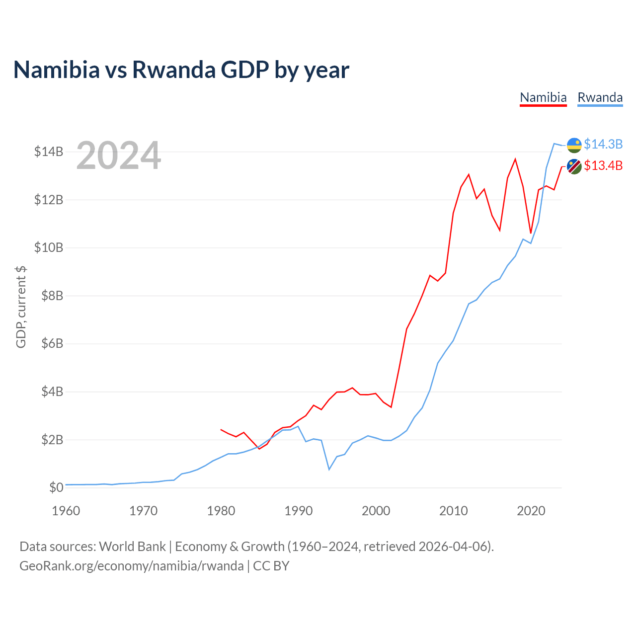 Namibia has a GDP of $13.4B compared to $14.3B for Rwanda, ranking 147/197 and 144/197 by economy size, respectively.