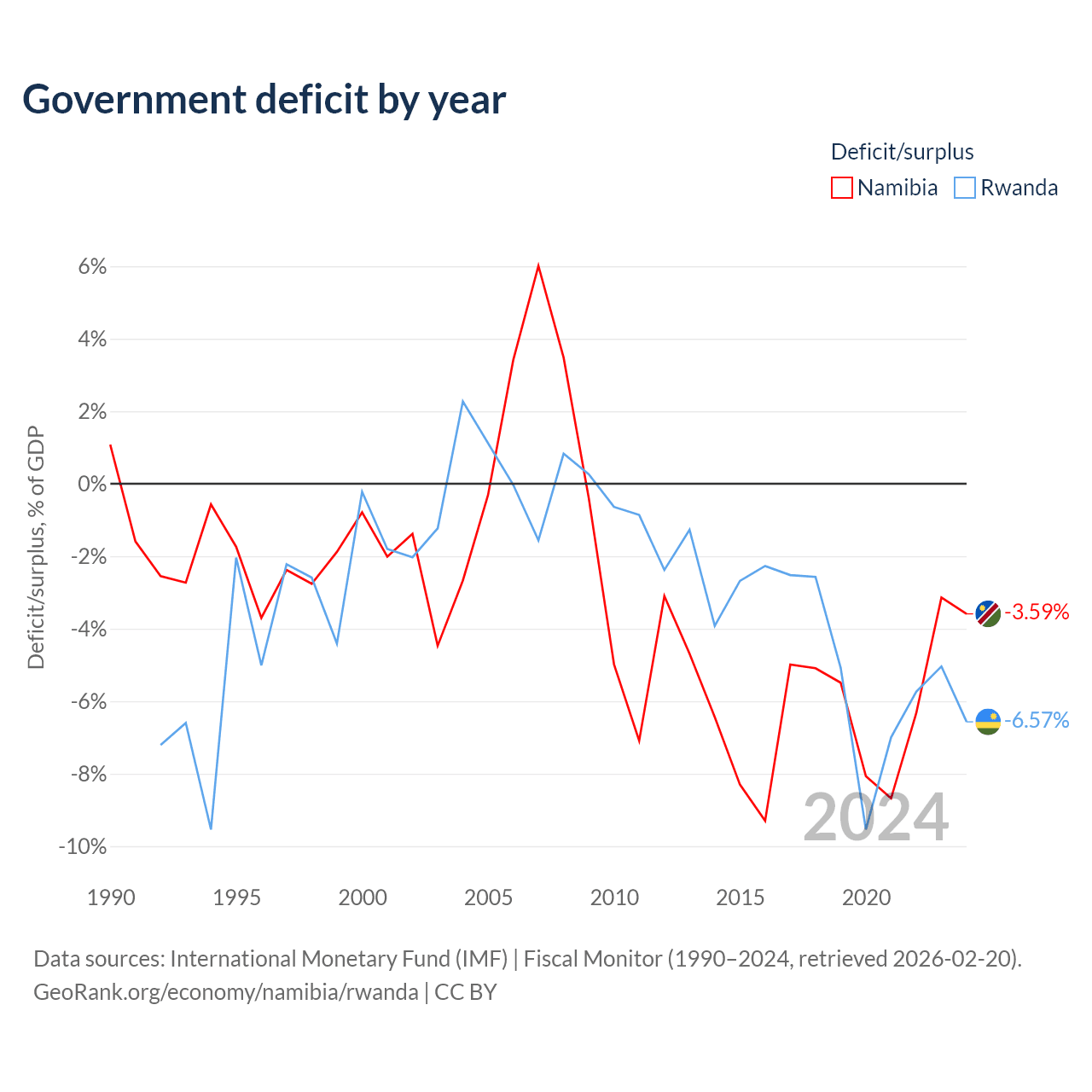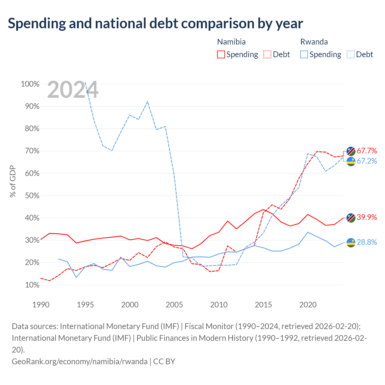 Namibia has $9.05B in government debt (67.7% of GDP), compared to $9.58B (67.2% of GDP) in Rwanda.