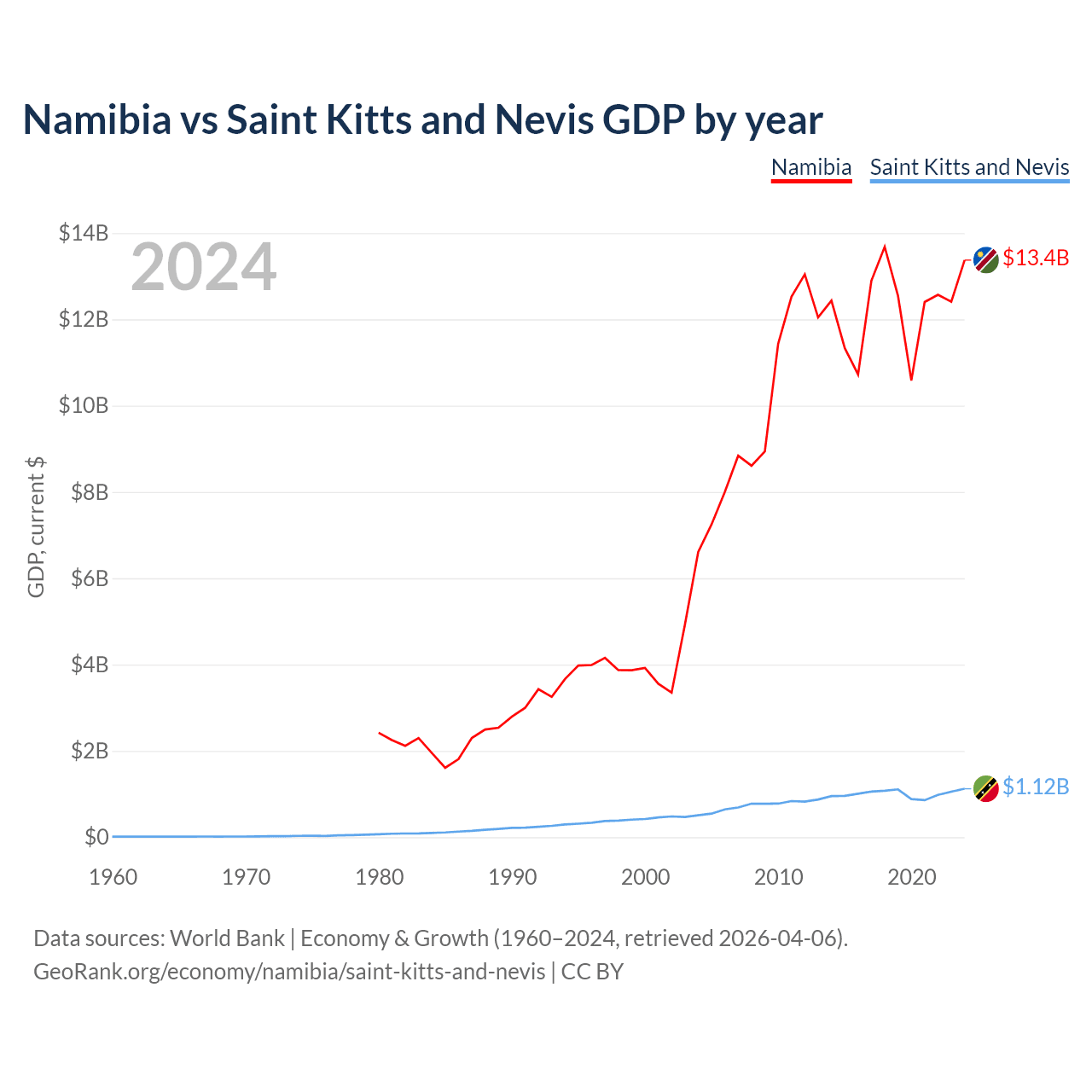 Namibia has a GDP of $13.4B compared to $1.12B for Saint Kitts and Nevis, ranking 147/197 and 187/197 by economy size, respectively.