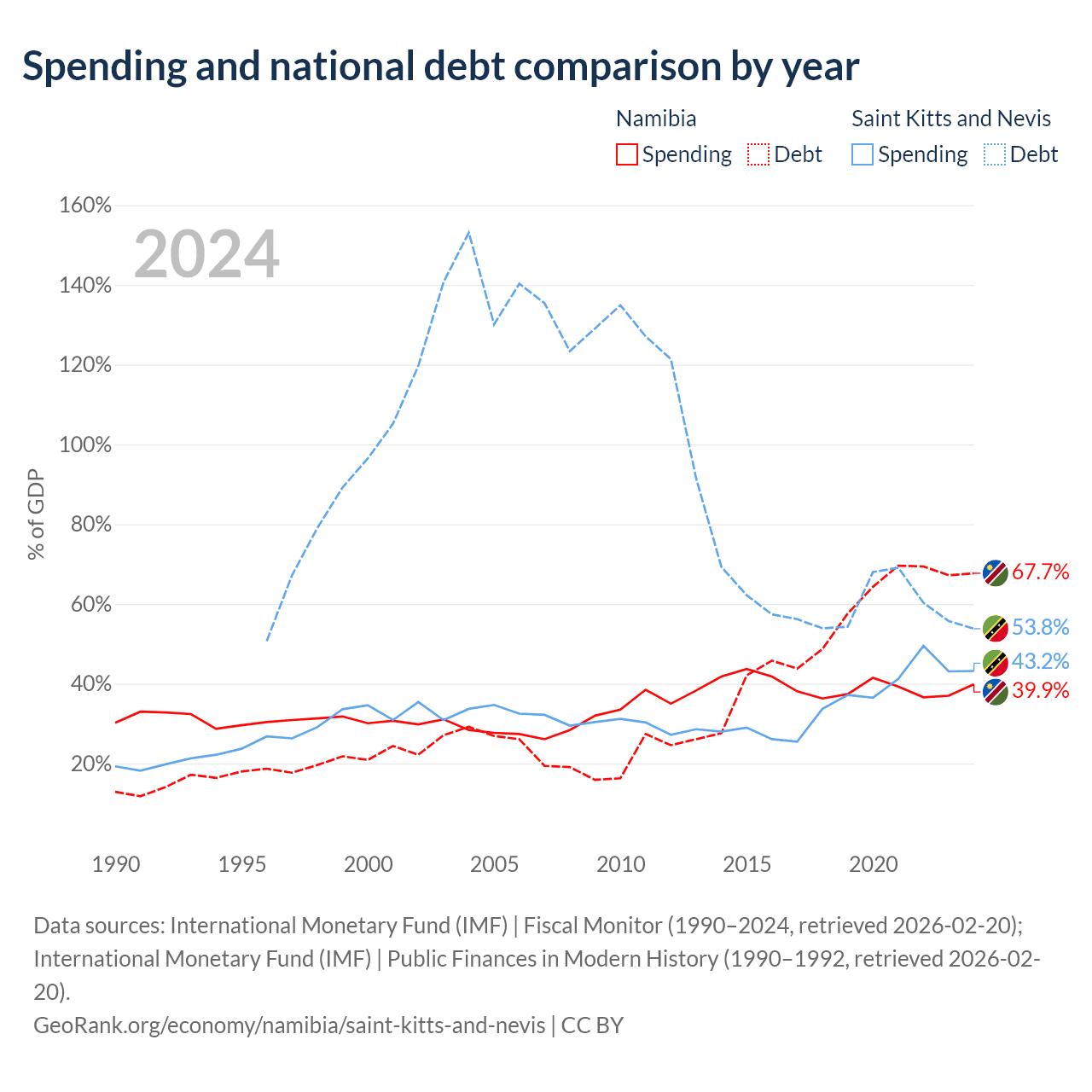 Namibia has $9.05B in government debt (67.7% of GDP), compared to $604M (53.8% of GDP) in Saint Kitts and Nevis.