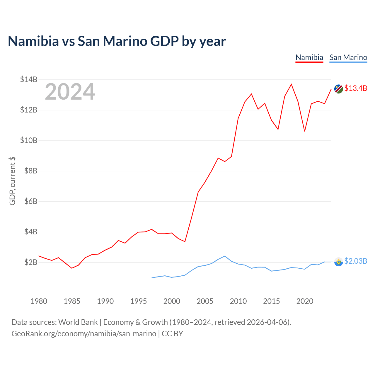 Namibia has a GDP of $13.4B compared to $2.03B for San Marino, ranking 147/197 and 180/197 by economy size, respectively.