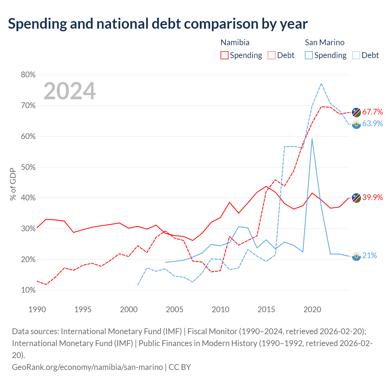 Namibia has $9.05B in government debt (67.7% of GDP), compared to $1.39B (63.9% of GDP) in San Marino.